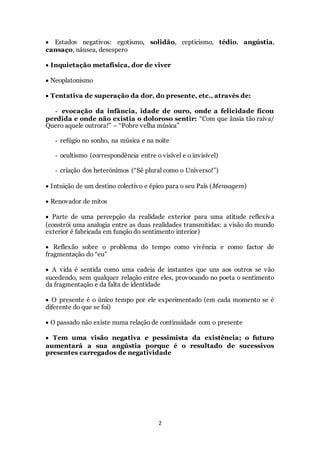 A poesia de Fernando Pessoa como ortónimo aborda temas como a angústia existencial, a nostalgia e a fragmentação do eu. O fingimento poético é inerente à sua obra, visto que a composição resulta de uma intelectualização das emoções, fruto de uma construção mental através da imaginação. Poemas como "Autopsicografia" e "Isto" refletem esta ideia de que a arte poética surge de algo pensado, não sendo mero desabafo sentimental.