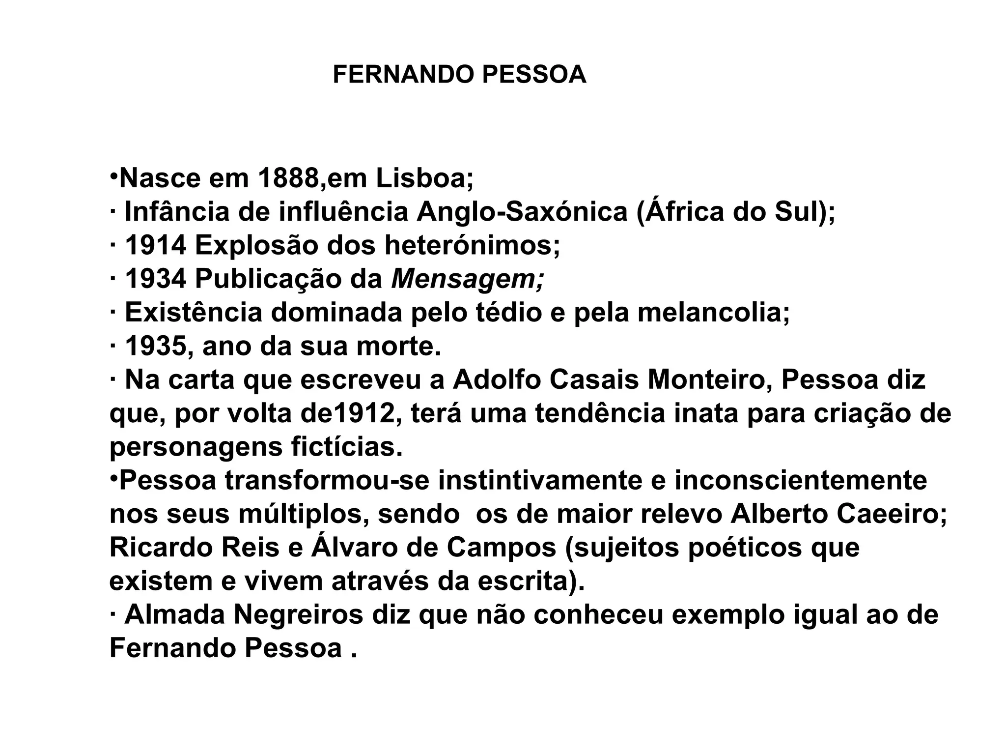 Fernando Pessoa (1888-1935) criou vários heterônimos literários que viveram através de sua escrita, incluindo Alberto Caeiro, mestre da poesia da natureza; Ricardo Reis, epicurista preocupado com a brevidade da vida; e Álvaro de Campos, expressando tédio, excesso e saudades da infância. Pessoa explorou a tensão entre sinceridade e fingimento através de sua obra.