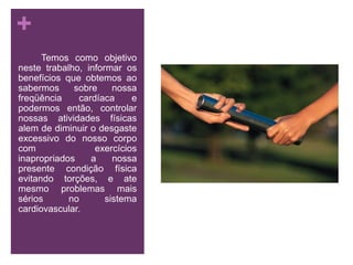 Este documento discute os benefícios de sabermos nossa frequência cardíaca e como podemos controlar nossas atividades físicas para evitar problemas de saúde. Explica como medir a frequência cardíaca de repouso, máxima e de recuperação, e como fatores como temperatura, desidratação e arritmia cardíaca afetam esses valores.