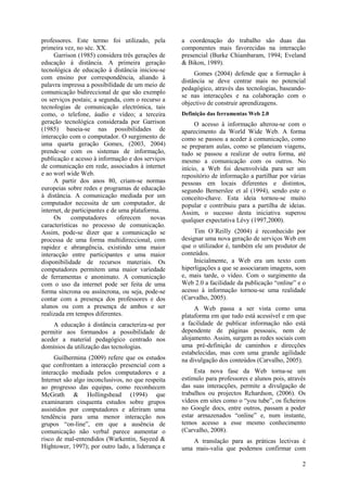 Este documento descreve uma pesquisa sobre como ferramentas da Web 2.0 e plataformas de aprendizagem online podem alterar as práticas de ensino. Ele apresenta ferramentas como Cmaps, Photo Story e livros digitais para professores, e usou uma plataforma Moodle para fornecer formação. Uma pesquisa foi realizada para ver se os professores alteraram suas práticas após o treinamento.