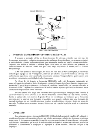 Este documento discute como a ferramenta de desenvolvimento de software GENEXUS é compatível com o método ágil Extreme Programming (XP). Ele descreve a história e evolução da ferramenta GENEXUS e como ela facilita o desenvolvimento ágil de software de acordo com os princípios do XP, como requisitos superficiais e constantemente mudando. A ferramenta prioriza o conhecimento do analista sobre o negócio para agilizar alterações e novas definições.