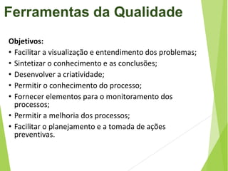 O documento apresenta três ferramentas da qualidade: brainstorming, diagrama de causa e efeito e 5W+2H. O brainstorming é usado para gerar ideias de forma criativa em grupos. O diagrama de causa e efeito serve para identificar possíveis causas de um problema. A técnica 5W+2H consiste em responder sete perguntas (que, quem, quando, onde, por que, como e quanto custa) para esclarecer um assunto.