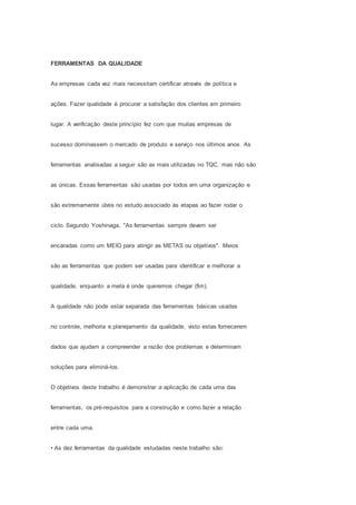 O documento discute dez ferramentas da qualidade, incluindo brainstorming, PDCA, fluxograma, folha de verificação e gráfico de Pareto. Ele explica o objetivo e uso de cada ferramenta para melhorar processos, identificar problemas e alcançar metas de qualidade.