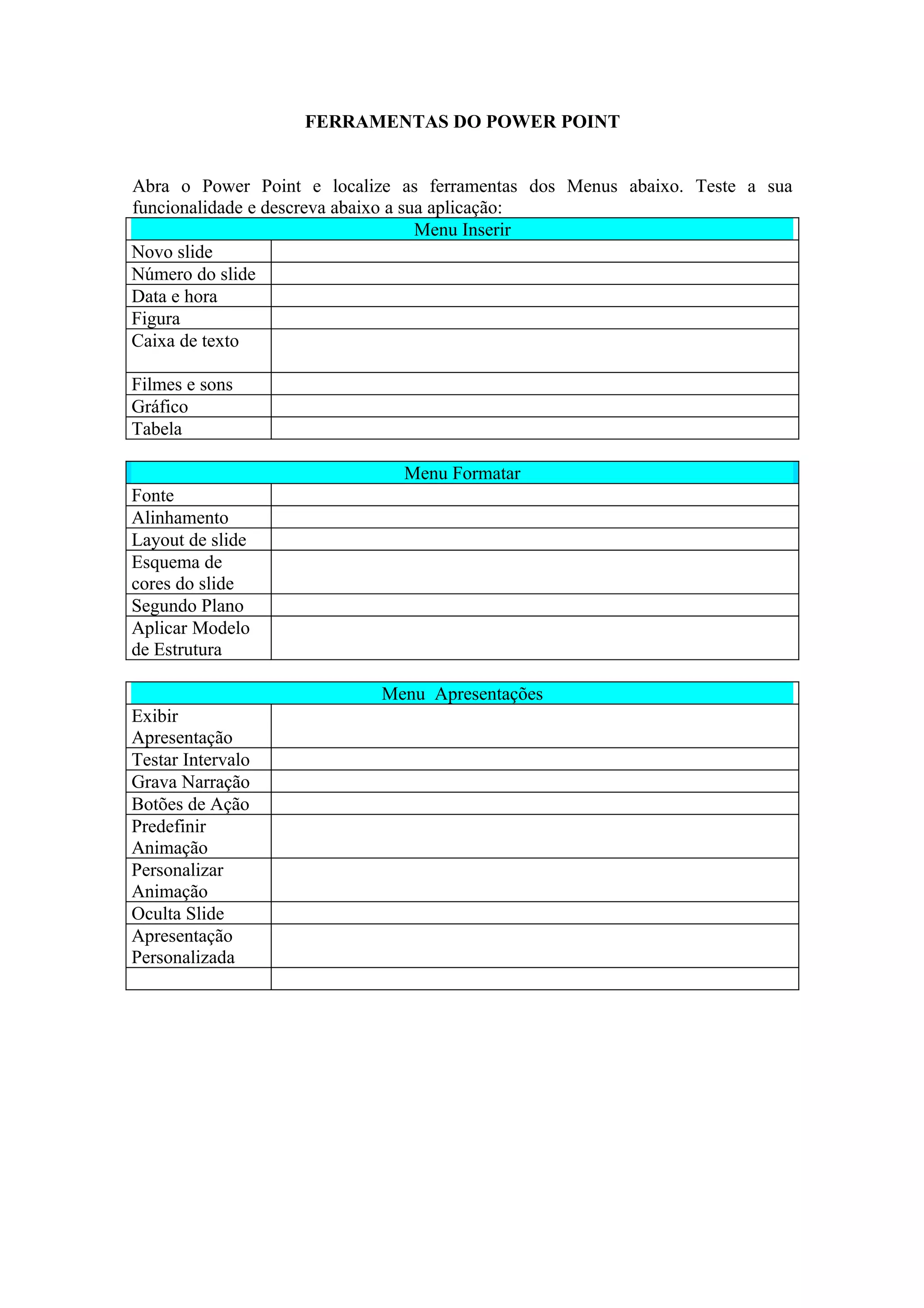 O documento descreve as ferramentas disponíveis nos menus Inserir, Formatar e Apresentações do PowerPoint, incluindo a capacidade de adicionar novos slides, texto, figuras, gráficos, tabelas, alterar formatação de fontes, alinhamento e cores, aplicar modelos de estrutura, gravar narrações e configurar apresentações.