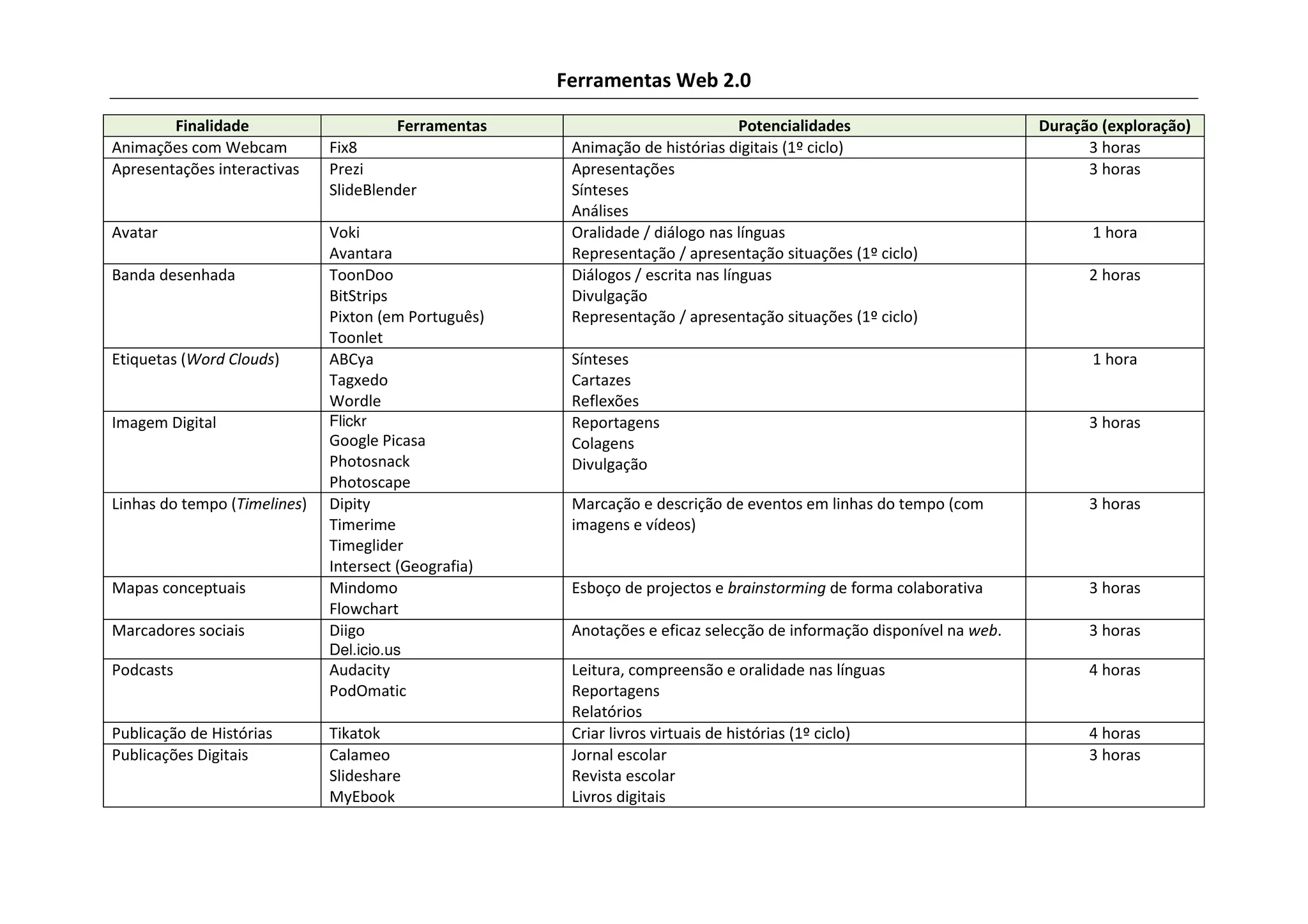 Este documento lista ferramentas digitais e suas potencialidades educativas, incluindo animações com webcam, apresentações interativas, avatares, banda desenhada digital, etiquetas, imagens digitais, linhas do tempo, mapas conceituais, marcadores sociais, podcasts, publicação de histórias, publicações digitais, sites web, trabalho colaborativo em blogs e wikis, vídeo digital, videocasts e webquests. Ele fornece detalhes sobre cada ferramenta como sua finalidade, potencialidades e dura