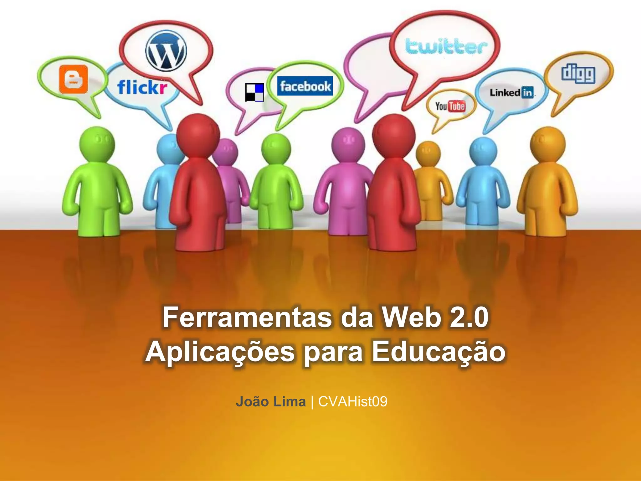 O documento discute as ferramentas da Web 2.0 e sua aplicação na educação. Ele define a Web 2.0 como uma segunda geração da internet com foco na colaboração e compartilhamento de informações entre usuários. Em seguida, descreve várias ferramentas como redes sociais, blogs, wikis e recursos de comunicação e como cada um pode ser usado com fins educacionais.