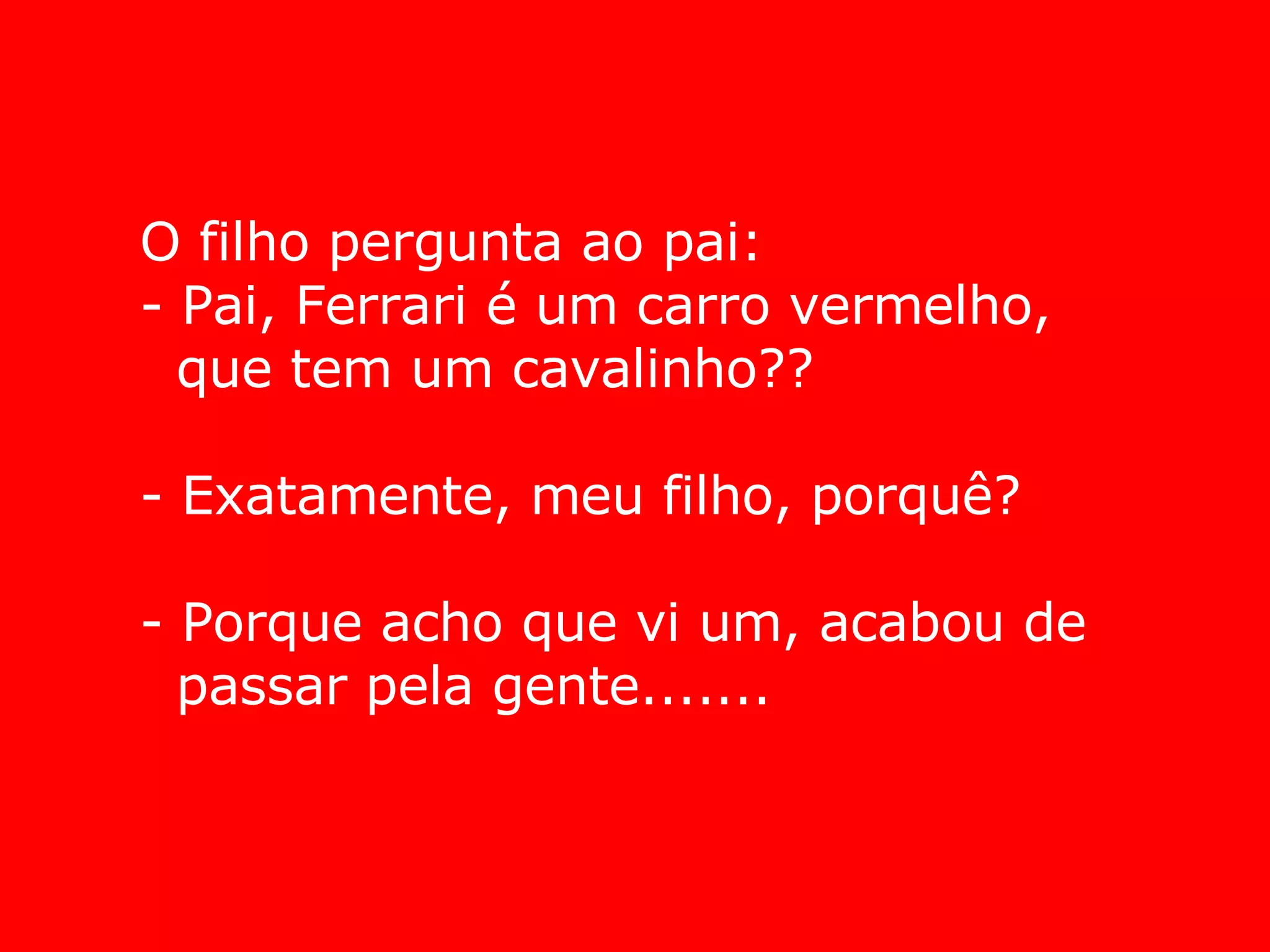 Uma criança pergunta ao pai se Ferrari é um carro vermelho com um cavalo estampado, e o pai confirma, pois acredita ter visto um passando por eles.