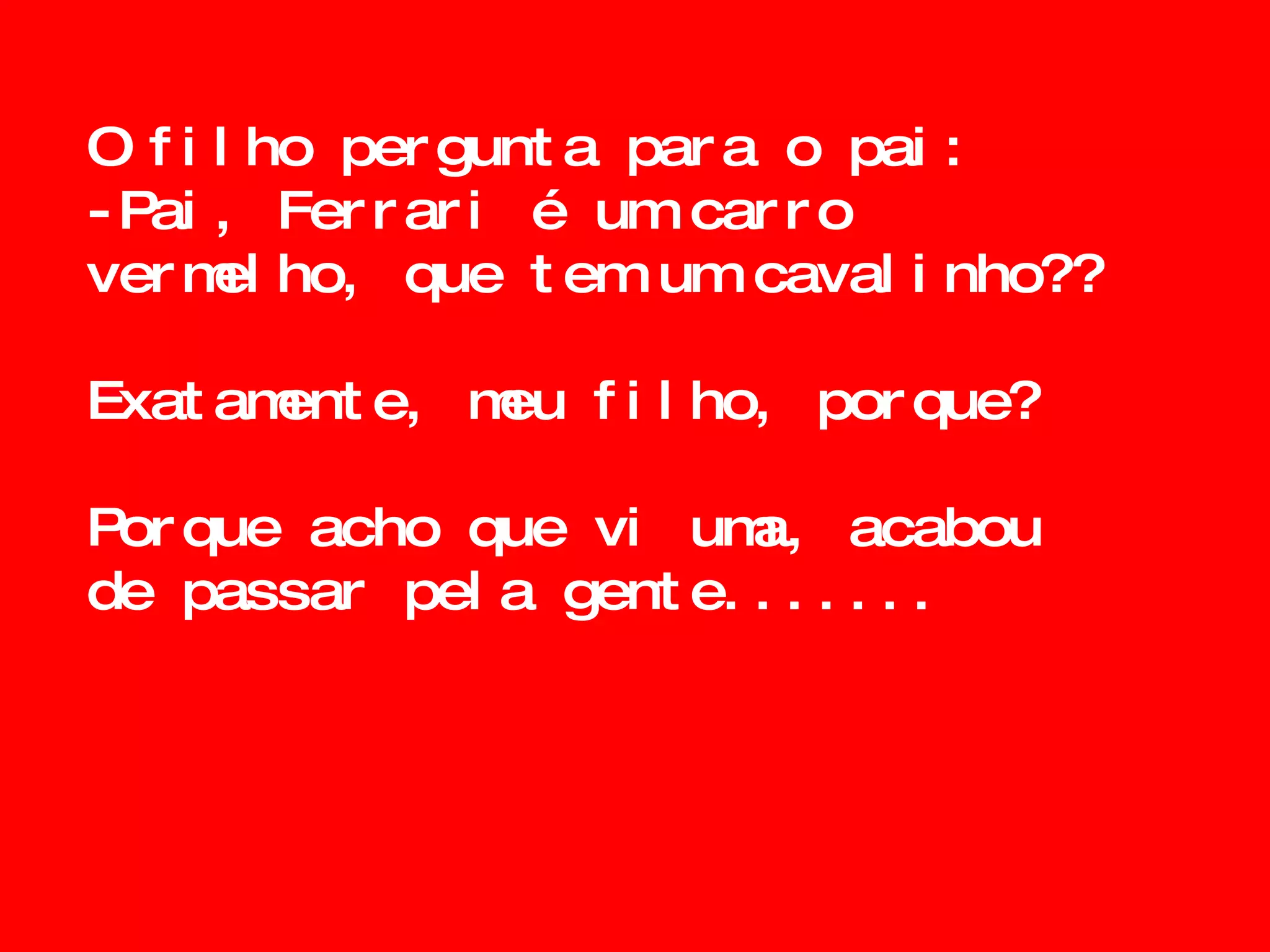 O filho perguntapara o pai: -Pai, Ferrari é um carro vermelho, que tem um cavalinho?? Exatamente, meu filho, porque? Porque acho que vi uma, acabou de passar pela gente.......