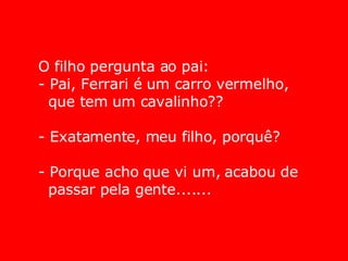 Uma criança pergunta ao pai se Ferrari é um carro vermelho com um cavalo estampado, e o pai confirma, pois acredita ter visto um passando por eles.