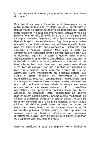 O documento discute a campanha contra a internação de doentes mentais no Brasil. O autor argumenta que a campanha foi inspirada por ideias importadas da Itália que fracassaram e causaram um desastre. A lei resultante praticamente acabou com os hospitais psiquiátricos públicos, deixando os doentes mentais mais graves sem tratamento adequado e muitos nas ruas. O autor defende a revogação desta lei.