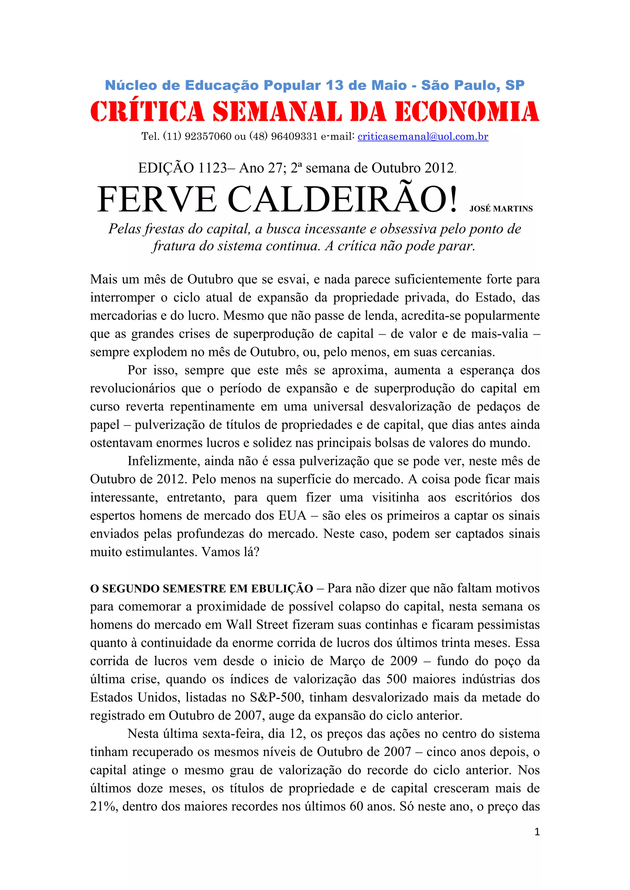 O documento analisa o atual estado da economia em outubro de 2012, destacando a expectativa de um possível colapso do capital devido ao aumento do pessimismo entre os dirigentes de grandes empresas. Apesar dos lucros de empresas como as listadas no S&P-500 terem crescido, há sinais de que a superprodução de capital pode estar prestes a desmoronar. A análise finaliza com a expectativa de novos dados da produção industrial que podem confirmar ou refutar essas perspectivas negativas.