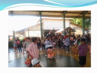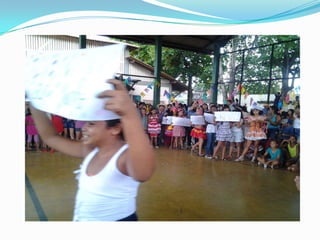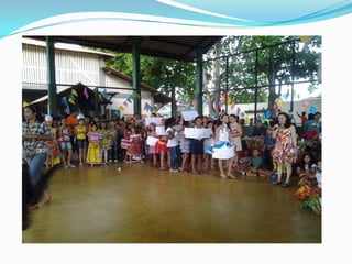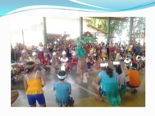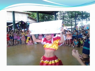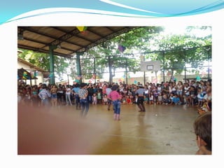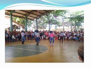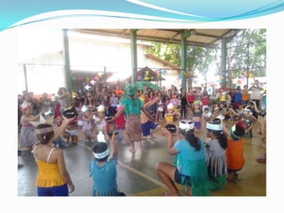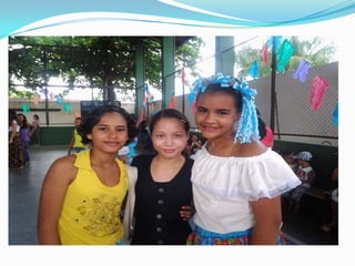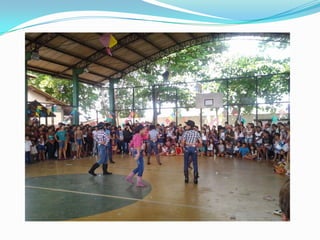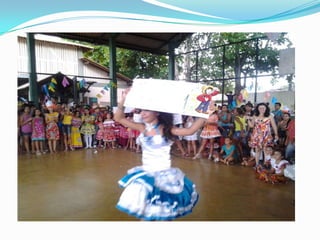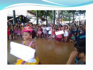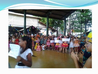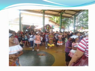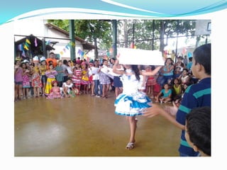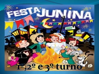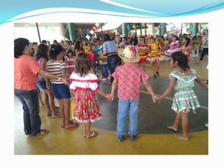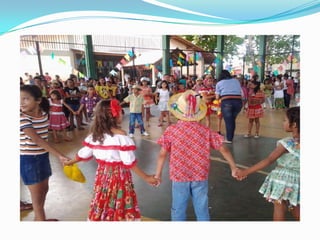As festas juninas reúnem dança e comidas típicas para homenagear três santos católicos em junho. A tradição inclui pular fogueira, dançar quadrilha, tomar quentão e canjica. A dança quadrilha surgiu na França no século XVIII e foi introduzida no Brasil durante a Regência, tornando-se popular nos salões do Rio de Janeiro no século XIX, embora suas evoluções tenham mudado com o tempo.