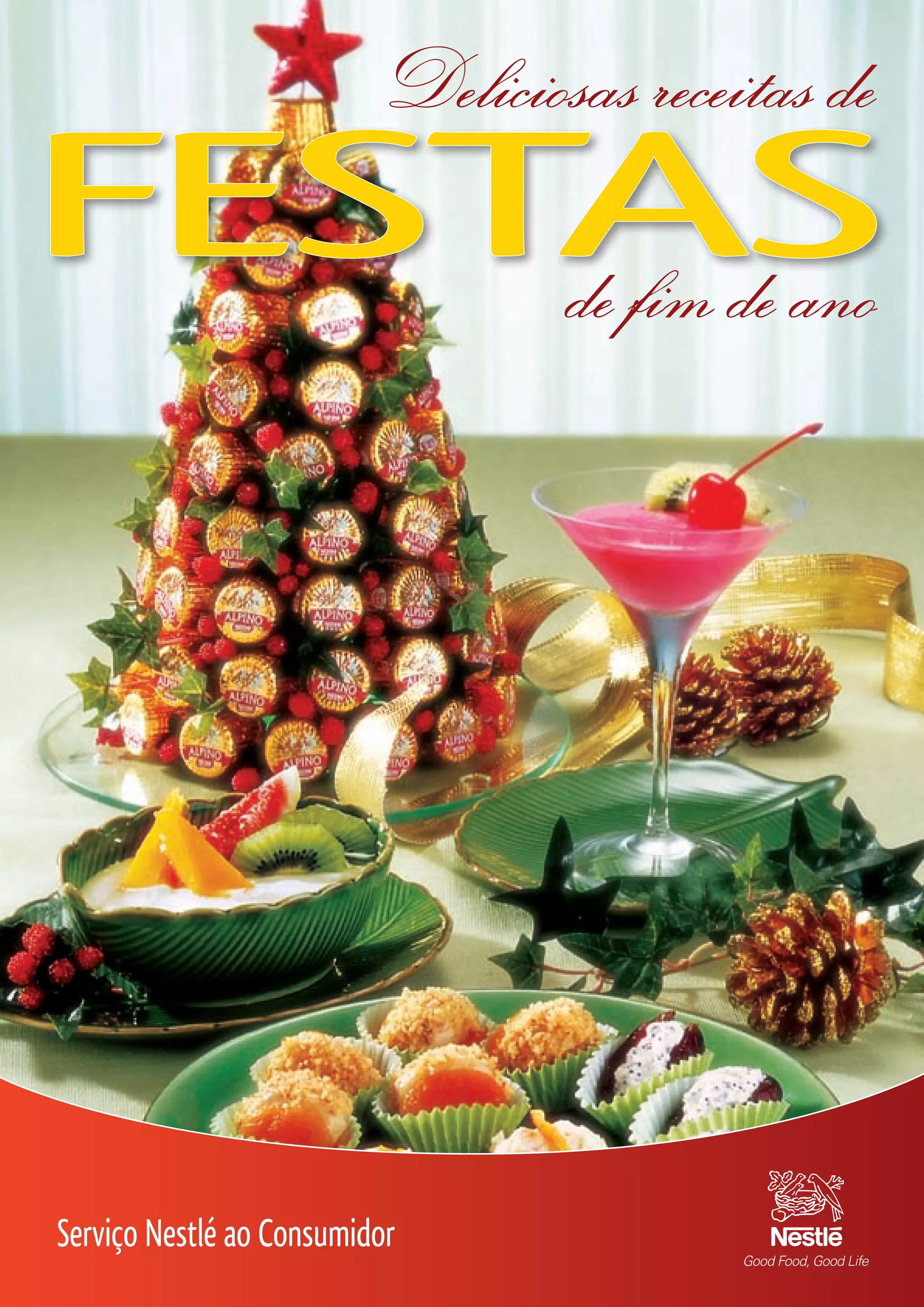 O documento fornece receitas para as festas de fim de ano, incluindo sugestões para o prato principal, acompanhamentos e sobremesas. Algumas das receitas destacadas são peru assado recheado com farofa, arroz com champanhe e amêndoas e docinho cremoso de Natal decorado com frutas.