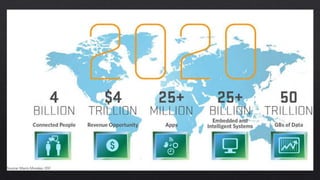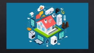 O documento discute conceitos de Internet das Coisas (IoT), incluindo exemplos de aplicações como medicina, indústria e educação. Também lista tecnologias comuns em IoT como sensores, plataformas como Intel Edison e ferramentas como o Slack API.