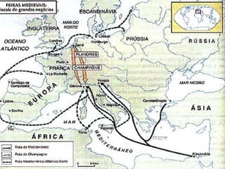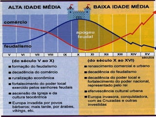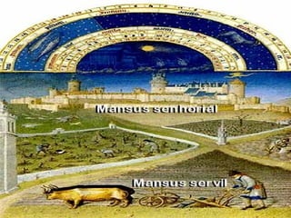 O documento descreve o sistema feudal da Idade Média, caracterizado pela descentralização do poder político e econômico entre a nobreza. A sociedade era dividida em três ordens: clero, nobreza e servos, cada um com papéis definidos. O feudalismo entrou em declínio com o crescimento das cidades e do comércio a partir do século XI.