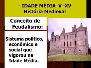 O documento descreve o sistema feudal da Idade Média, caracterizado pela descentralização do poder político e econômico entre a nobreza. A sociedade era dividida em três ordens: clero, nobreza e servos, cada um com papéis definidos. O feudalismo entrou em declínio com o crescimento das cidades e do comércio a partir do século XI.