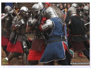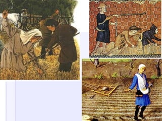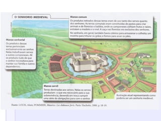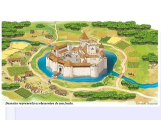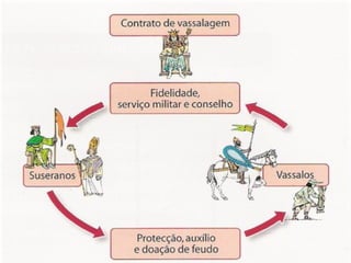 O documento descreve as origens e estrutura do sistema feudal na Europa medieval. O feudalismo surgiu da instabilidade do Império Romano e levou à descentralização do poder. A sociedade era dividida em três grupos principais: o clero, a nobreza e os servos. Os servos trabalhavam a terra em troca de proteção e pagavam tributos aos senhores feudais.
