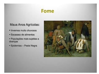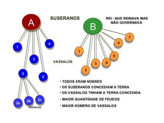 O documento descreve a formação e características do sistema feudal na Europa, desde as invasões bárbaras no Império Romano até seu declínio. O feudalismo surgiu da necessidade de manter a ordem em meio ao caos das invasões, estabelecendo uma estrutura de senhores e vassalos. Sua estrutura entrou em crise devido à fome, peste negra e guerras como a dos Cem Anos, abrindo caminho para seu fim e a ascensão de uma nova classe burguesa.