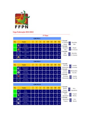 O documento apresenta resultados parciais de 4 grupos (C, F, H) de uma liga de futebol da época 2011/2012. No Grupo C, o Abação lidera com 3 pontos, seguido do A. Quinchães também com 3. No Grupo F, o Montesinhos lidera com 3 pontos. No Grupo H, Irivo e Tougues lideram ambos com 3 pontos.