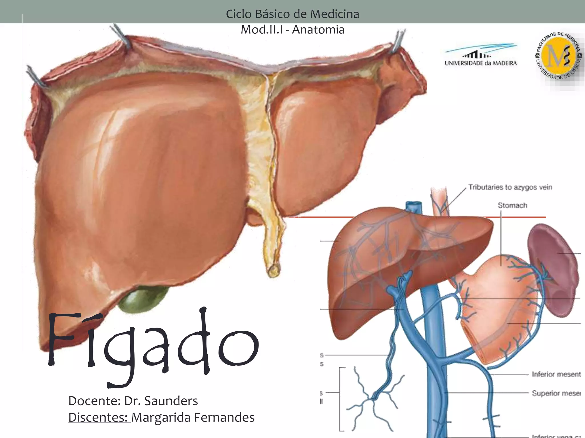 O documento descreve a anatomia do fígado, incluindo sua localização, forma, tamanho, segmentos, vasos sanguíneos e linfáticos, nervos e meios de fixação. Fornece detalhes sobre os lobos, faces e bordos do fígado, assim como sua vascularização através da veia porta hepática e artérias hepáticas.