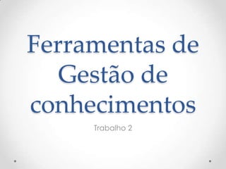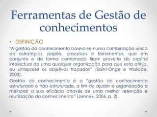 O documento discute ferramentas de gestão de conhecimento como intranet, gestão eletrônica de documentos e e-learning. Também descreve características e vantagens do Microsoft Dynamics CRM e ERP, incluindo gerenciamento de cadeia de suprimentos, business intelligence, recursos humanos, finanças e projetos.