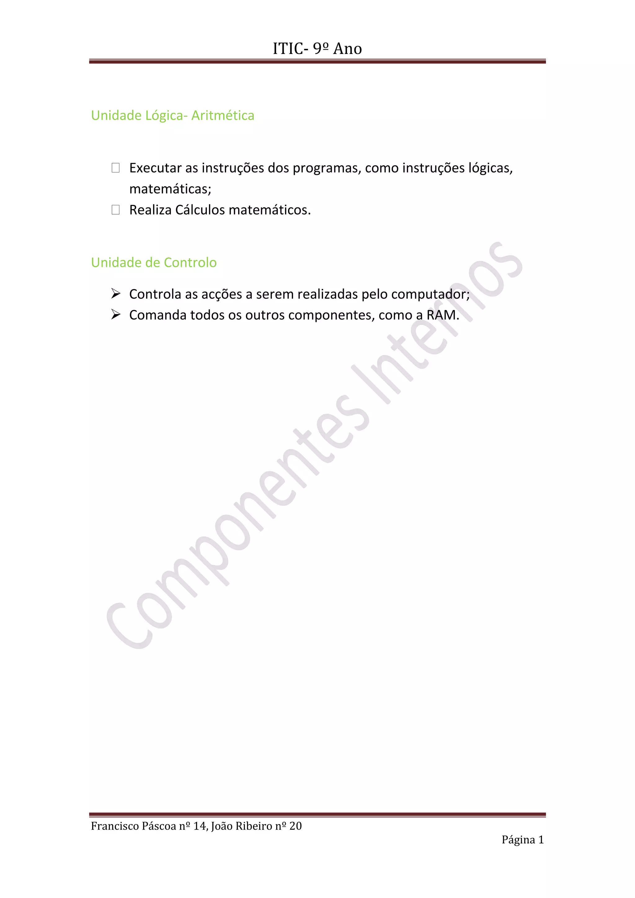 O documento discute os componentes de um computador. A unidade lógica-aritmética executa instruções de programas como operações matemáticas. A unidade de controle controla as ações do computador e comanda outros componentes como a RAM. A memória RAM é volátil e armazena programas em execução, enquanto a ROM armazena instruções de forma permanente.