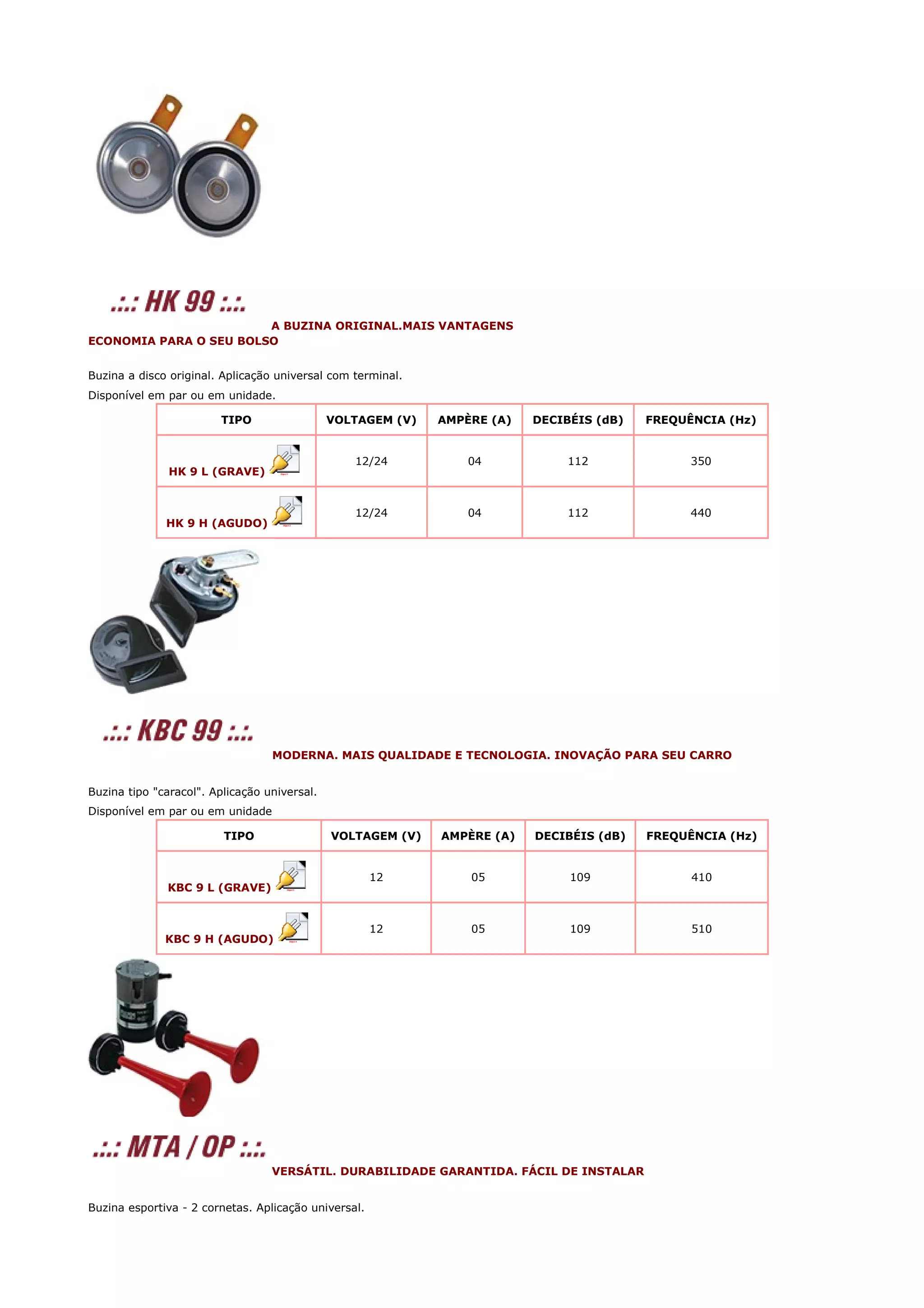 O documento descreve nove modelos de buzinas para veículos, fornecendo suas especificações técnicas como voltagem, corrente, decibéis e frequência. As buzinas variam de modelos tradicionais de disco a modelos esportivos de alta potência.