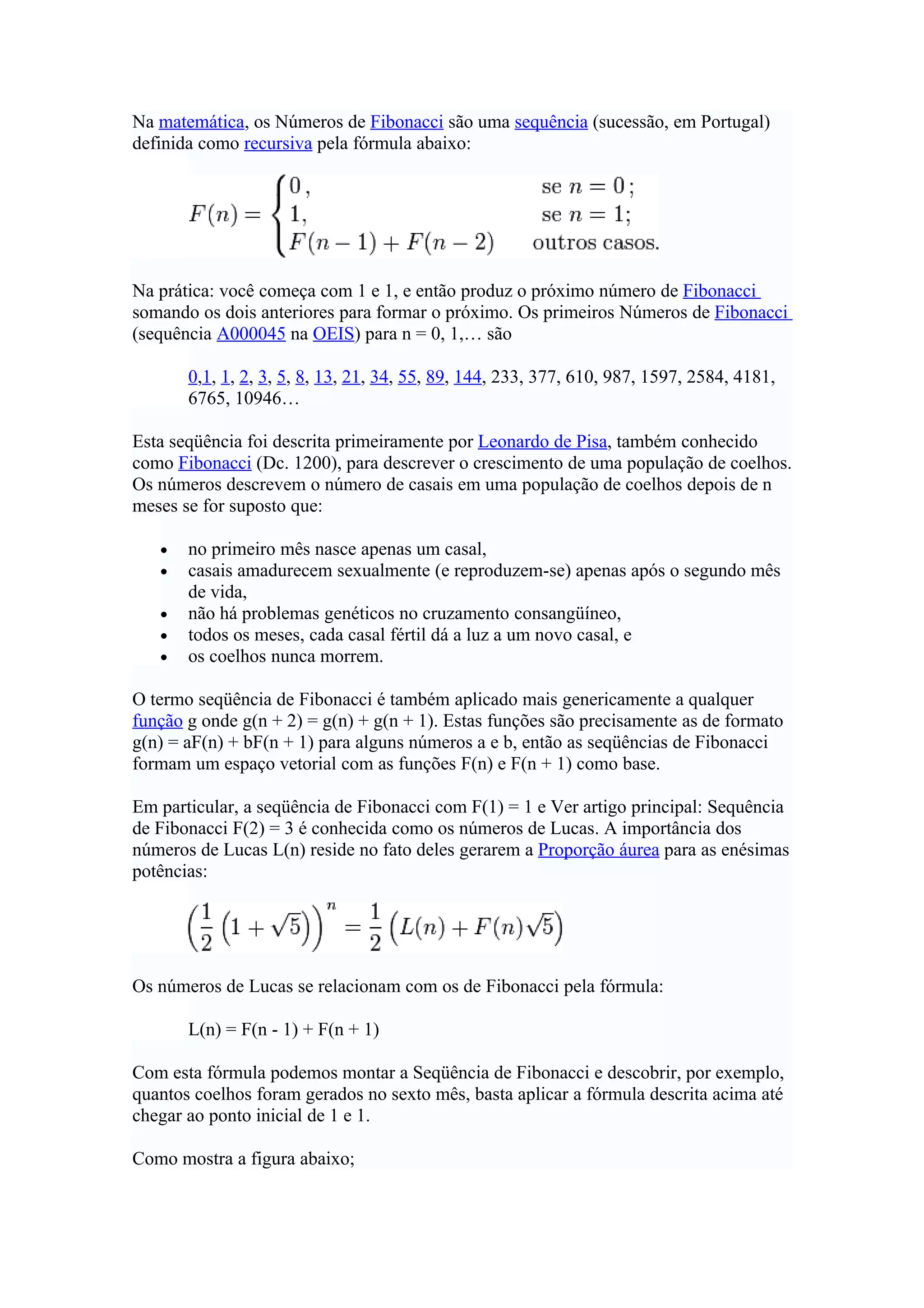 O documento descreve a sequência de Fibonacci, na qual cada número é a soma dos dois anteriores. Começa com 1, 1 e prossegue para 2, 3, 5, 8 e assim por diante. Essas quantidades descrevem o crescimento populacional de coelhos. O texto também discute generalizações como números de Lucas e aplicações em áreas como música, arquitetura e mercado financeiro.
