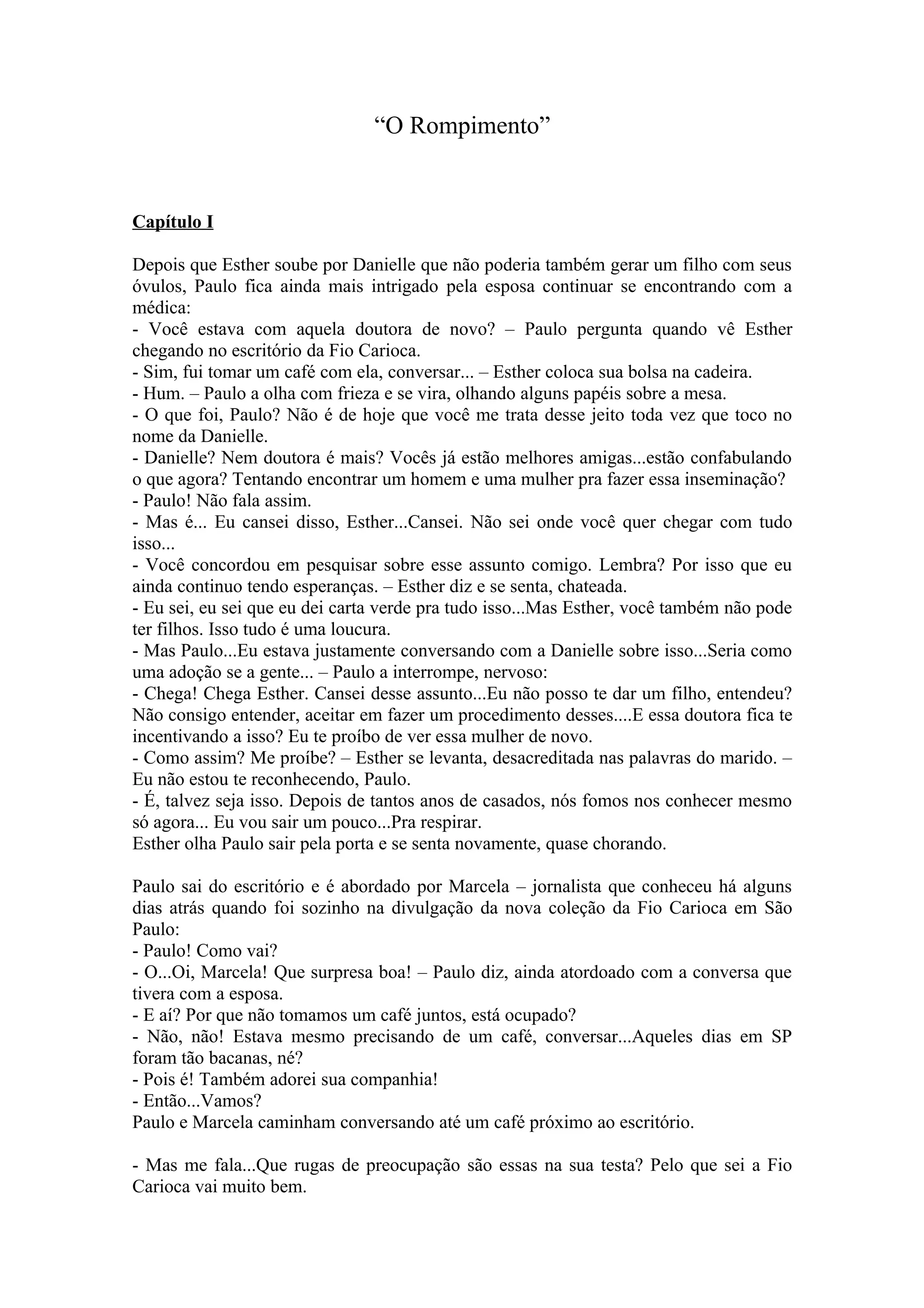 Paulo e Esther estão passando por um período de desentendimentos e distanciamento em seu casamento. Paulo está incomodado com a proximidade de Esther com a médica Danielle em relação a tratamentos de fertilização, e os dois têm visões diferentes sobre adoção versus inseminação artificial. Enquanto isso, Paulo conhece a jornalista Marcela, o que deixa Esther desconfiada de uma possível atração.