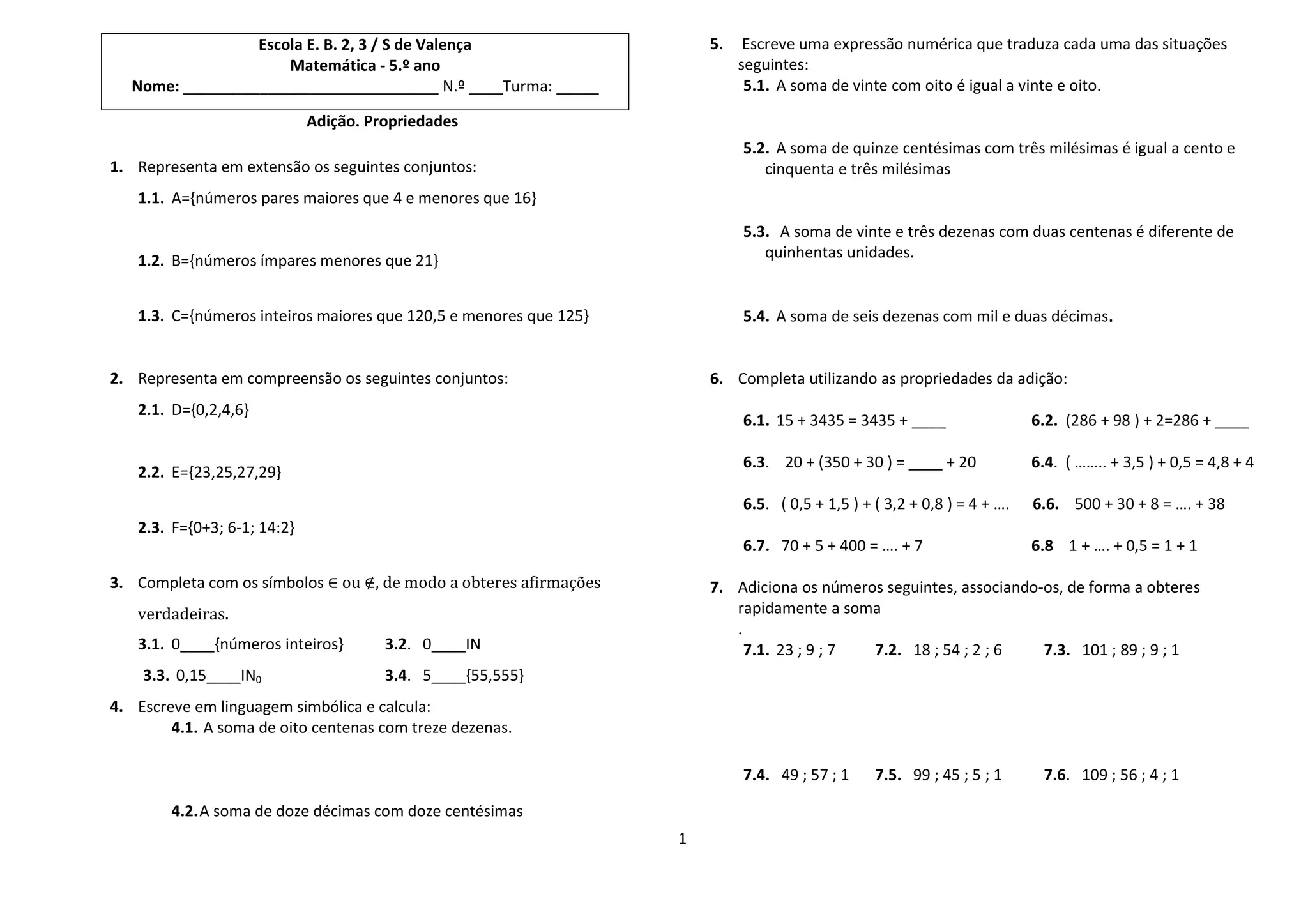 Este documento apresenta exercícios sobre propriedades da adição de números inteiros e decimais. Os alunos devem completar expressões numéricas, calcular somas utilizando propriedades como a comutatividade e associatividade, e completar igualdades para obter determinados resultados.