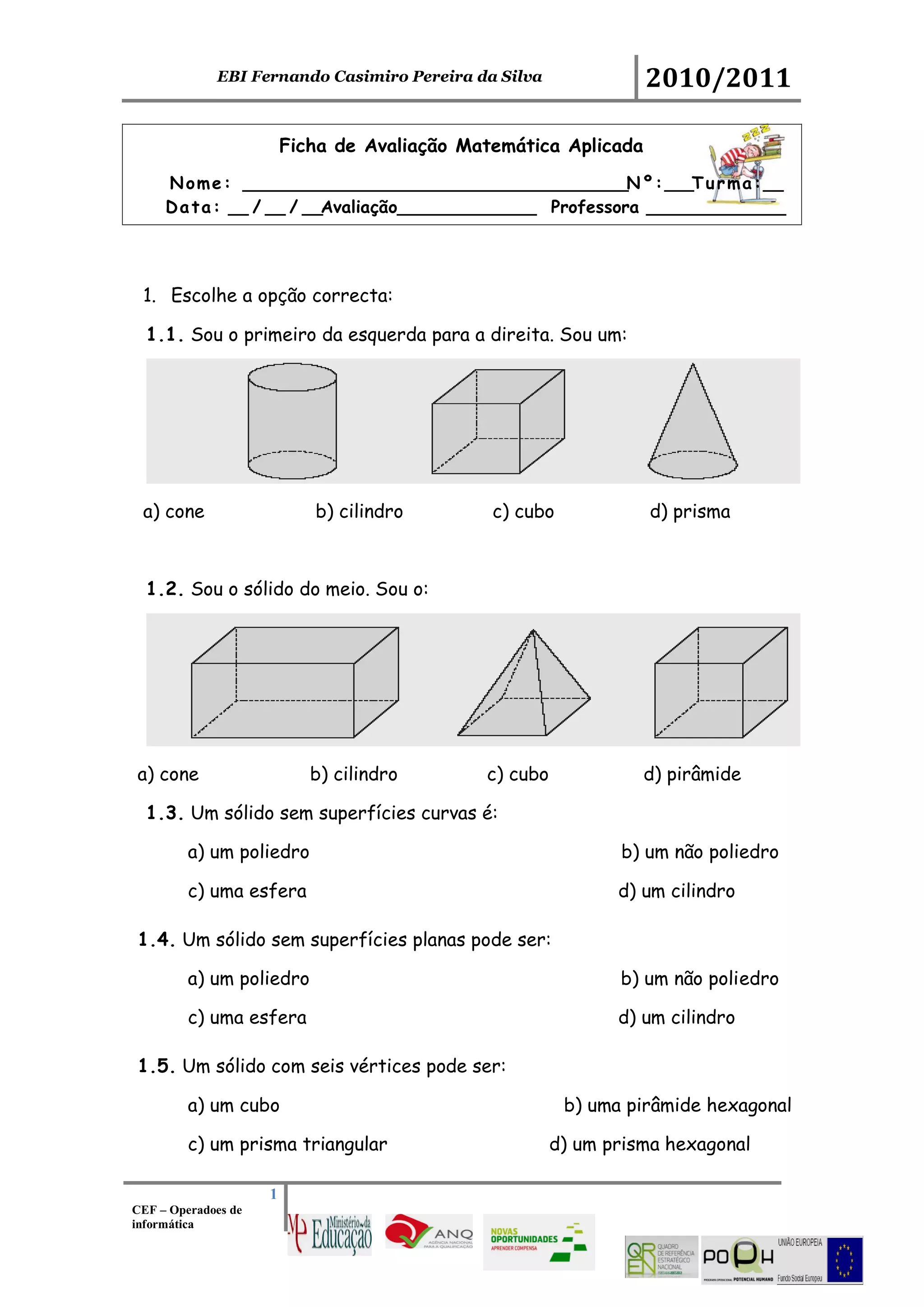 Este documento contém uma avaliação de matemática aplicada com questões sobre sólidos geométricos. A avaliação inclui questões de escolha múltipla sobre características de cone, cubo, pirâmide, prisma e cilindro. Também contém questões para completar frases sobre a definição de cilindro e identificar quais planificações não formam um cilindro.