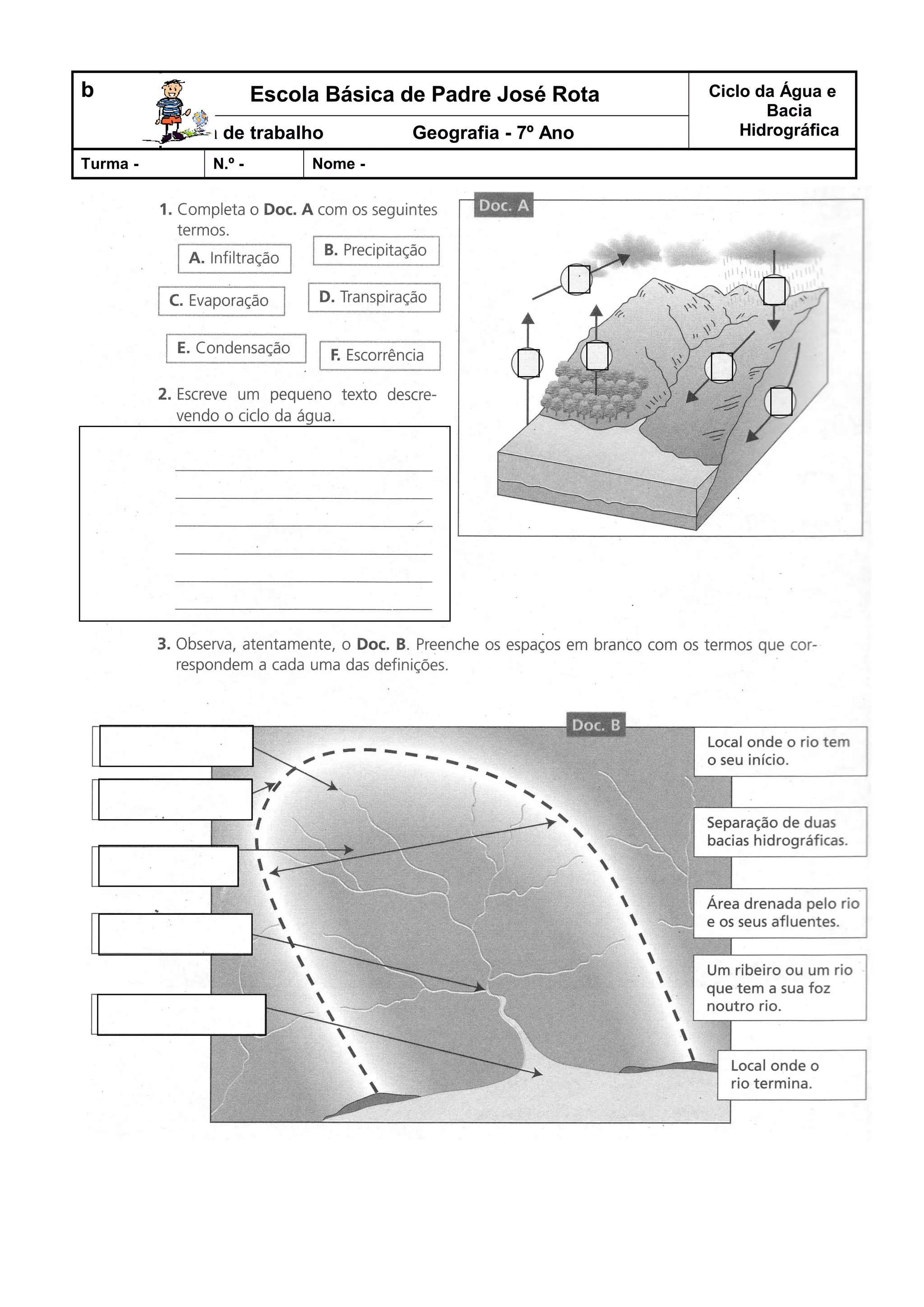 O documento trata de um trabalho de geografia sobre o ciclo da água e bacias hidrográficas para alunos do 7o ano. No entanto, não há informações adicionais no documento fornecido.