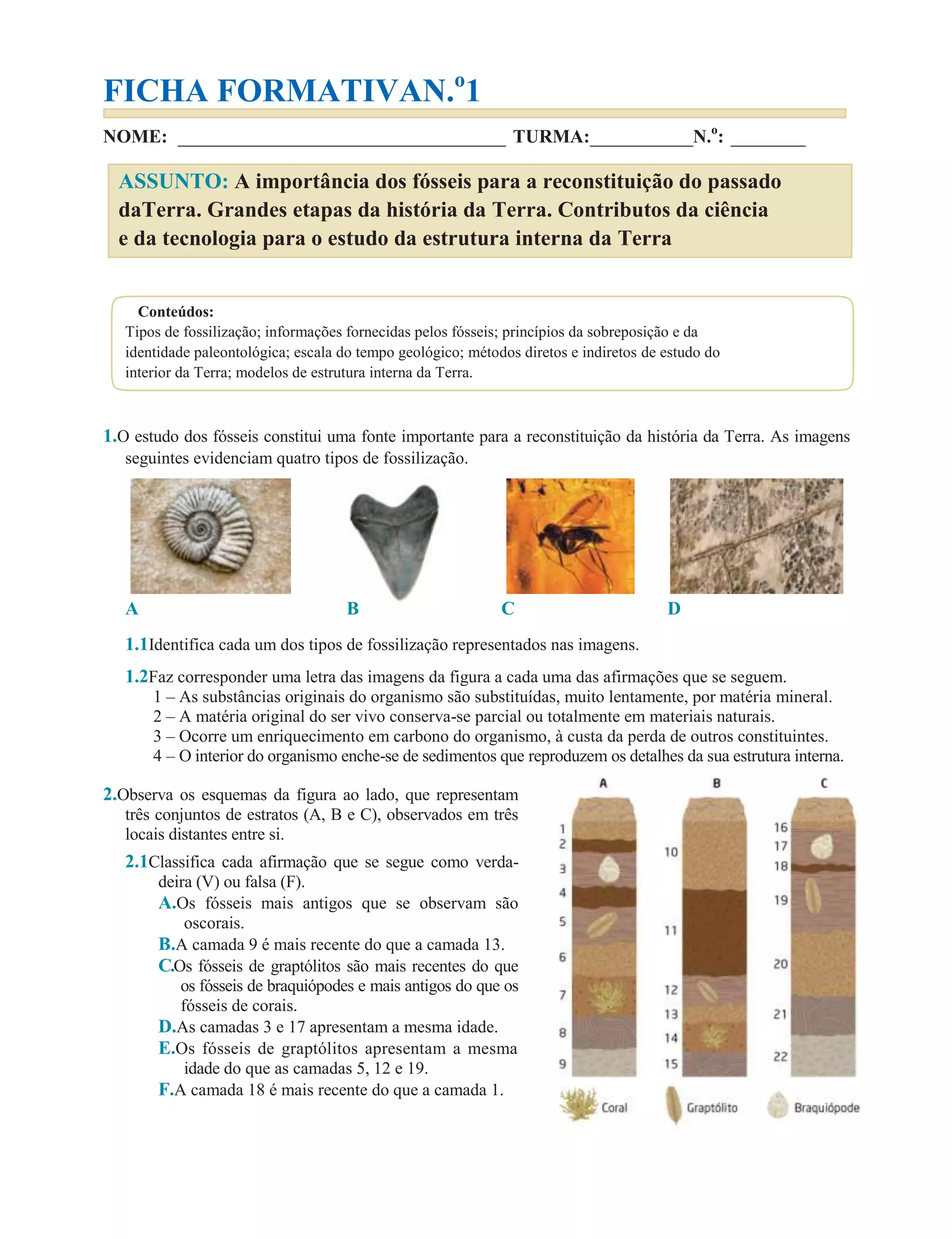 O documento discute a importância dos fósseis para reconstruir a história da Terra, identificando quatro tipos de fossilização e discutindo princípios como sobreposição e escala geológica do tempo. Ele também aborda métodos de estudar a estrutura interna da Terra e modelos de sua estrutura.