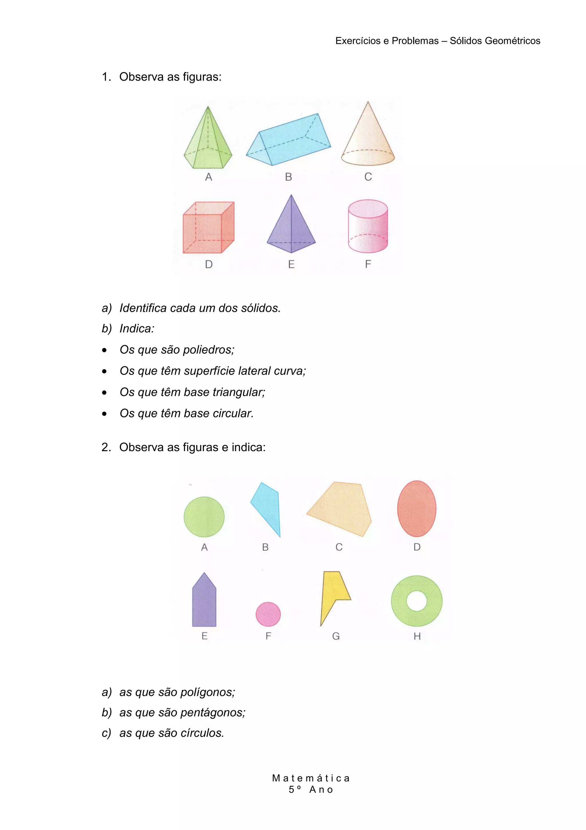 O documento apresenta 20 exercícios sobre sólidos geométricos. Os exercícios pedem para identificar, classificar e desenhar diferentes sólidos como pirâmides, prismas e paralelepípedos retângulos e perguntam sobre suas propriedades como número de faces, vértices e arestas.