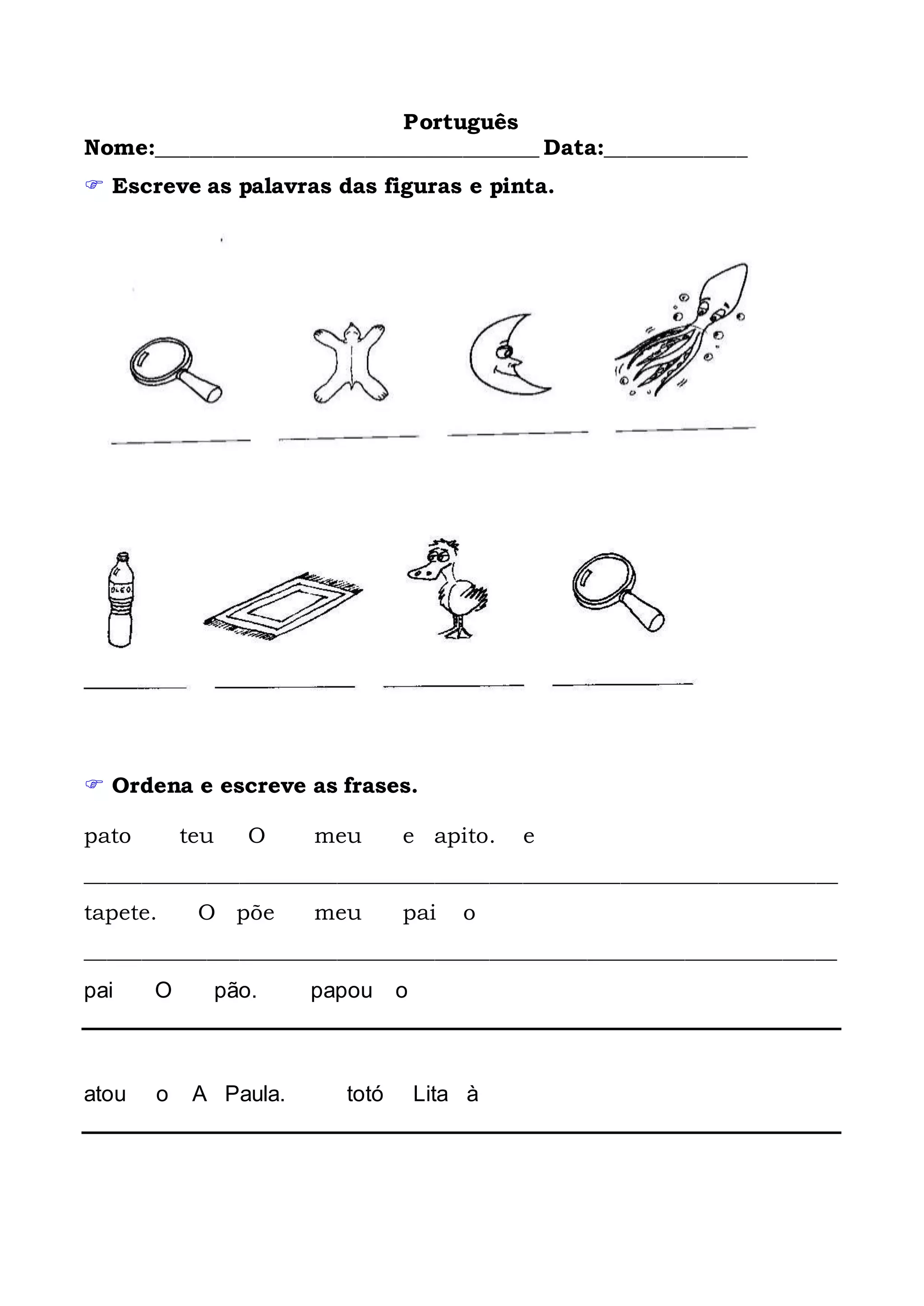 1) A atividade pede para a criança escrever as palavras das figuras e pintá-las, e ordenar e escrever frases. 2) Pede para ler, copiar e completar frases curtas com palavras faltantes. 3) Solicita que a criança complete as atividades propostas.