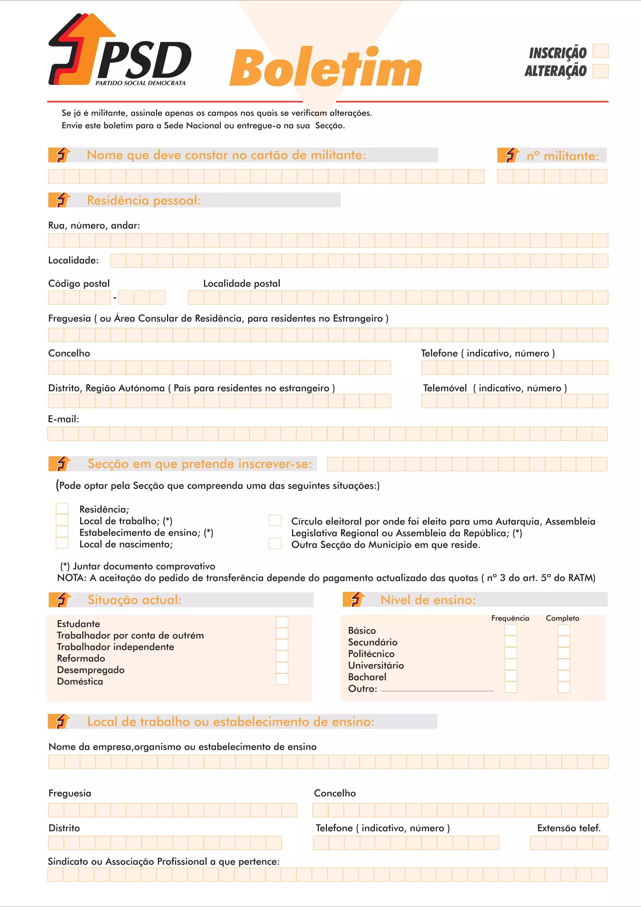 [1] Este boletim é para inscrição ou alteração de dados de militância no Partido Social Democrata. [2] Solicita dados pessoais e profissionais do militante como nome, residência, local de trabalho. [3] Também pede informação sobre participação em organizações como JSD ou TSD e proposta de um militante ativo.