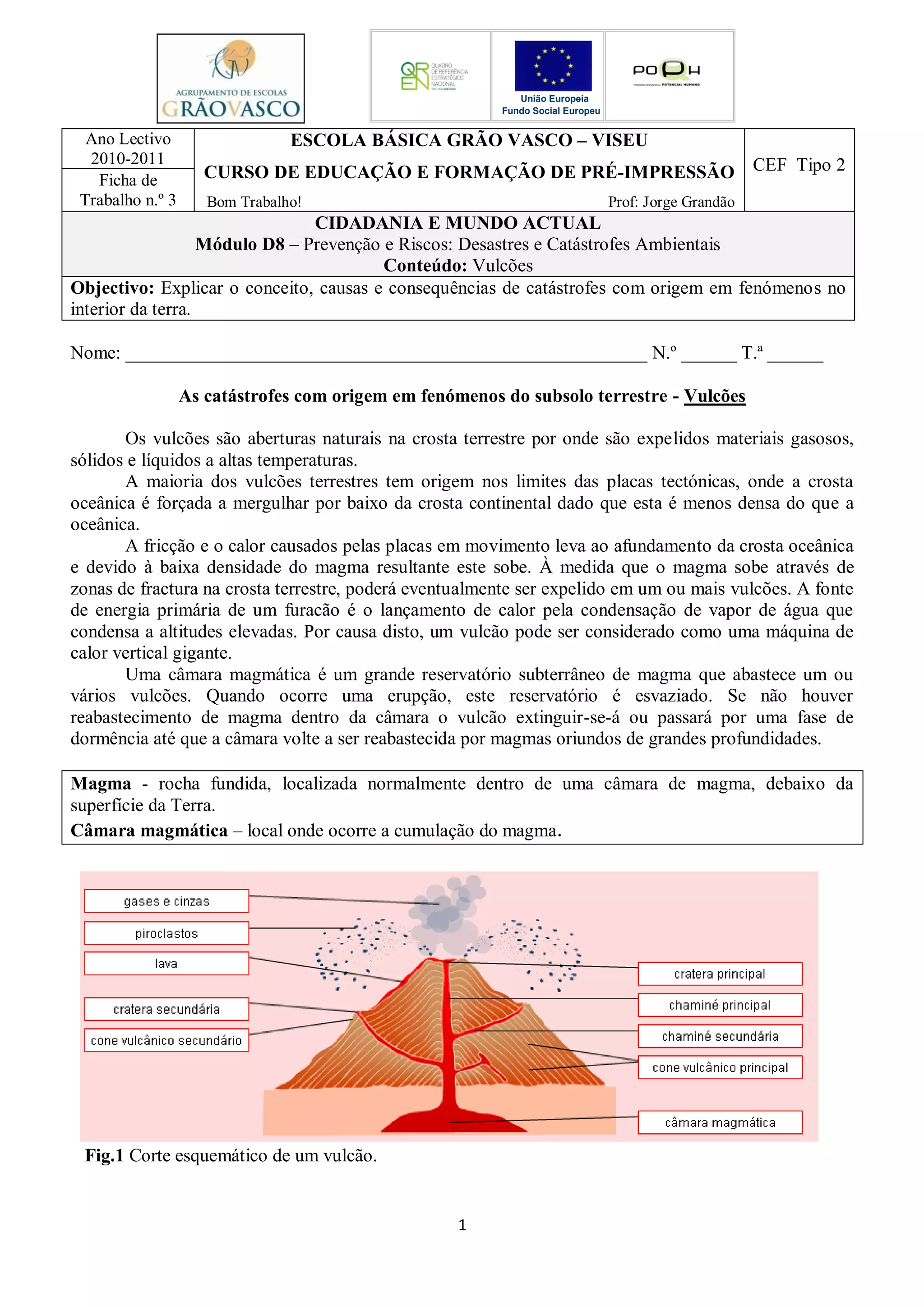 Este documento fornece informações sobre vulcões, incluindo sua definição, causas e exemplos. Explica que vulcões se formam nas bordas de placas tectônicas e que o magma sobe através de fissuras, eventualmente sendo expelido. Também descreve componentes vulcânicos como câmaras de magma e cones, e apresenta um exemplo recente de erupção do vulcão Etna na Sicília.