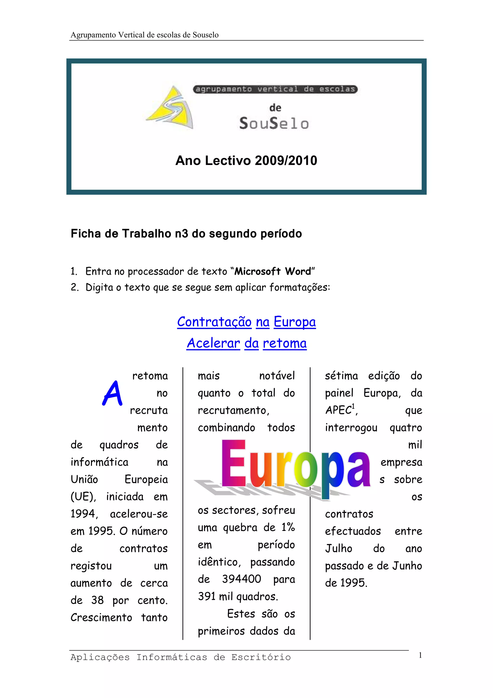 Este documento fornece instruções para formatar um texto sobre recrutamento na União Europeia em 1995. Inclui instruções para formatar o título, texto, cabeçalho, rodapé e tabela com diferentes fontes, tamanhos de letra, cores, alinhamentos e efeitos.