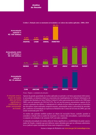 O Tribunal de Contas da União analisou a arrecadação de multas aplicadas por órgãos federais entre 2008-2010 e constatou que, embora tenham sido aplicadas 734.830 multas totalizando R$24 bilhões, apenas R$1,1 bilhão (4,7% do total) foi efetivamente arrecadado. A baixa arrecadação afeta a credibilidade do poder sancionador do Estado.