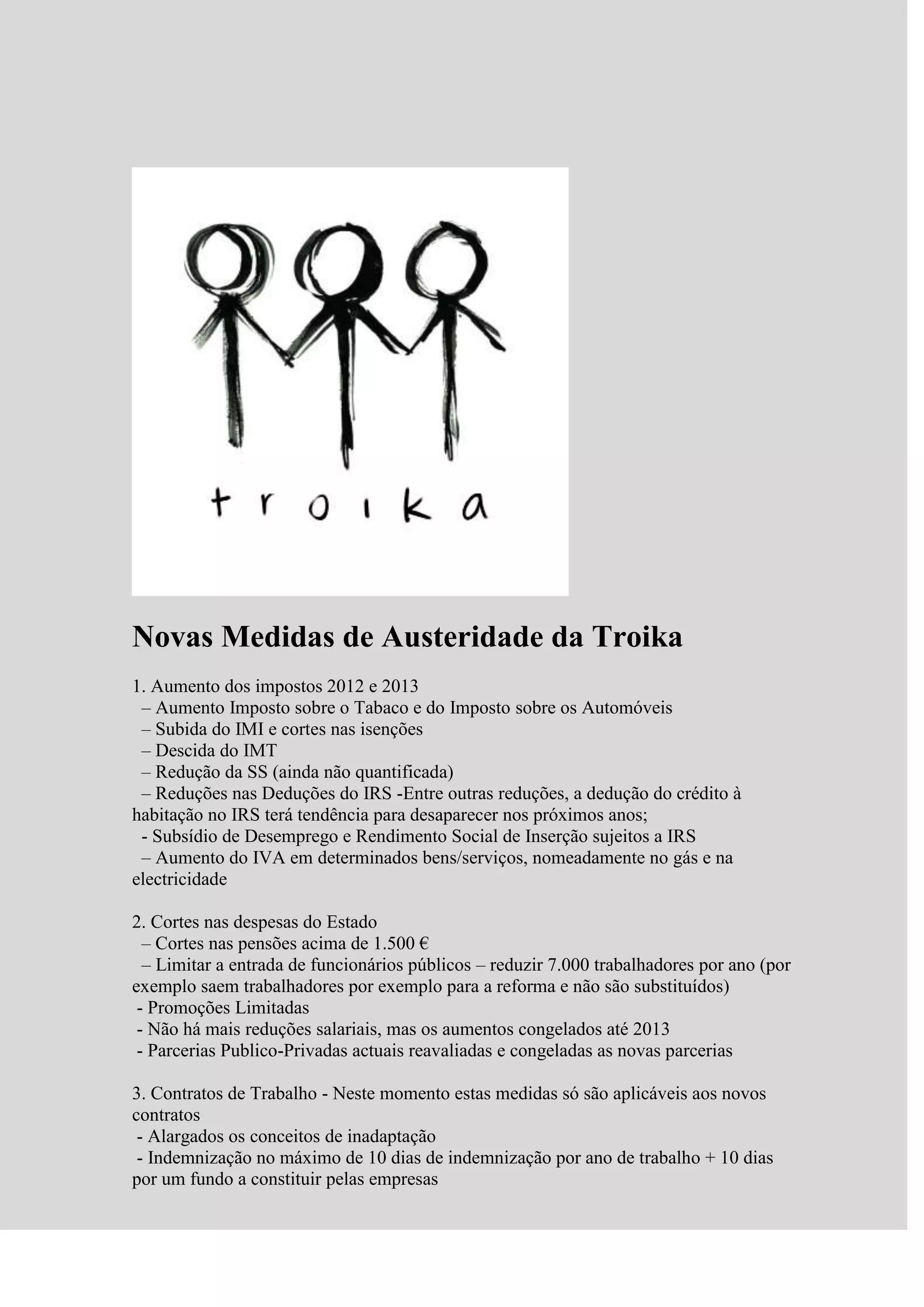 O documento descreve novas medidas de austeridade impostas por credores internacionais, incluindo aumentos de impostos e cortes em gastos com funcionários públicos, pensões e subsídios de desemprego. Além disso, a dívida pública portuguesa ultrapassará o PIB em 2011 e o défice orçamental no primeiro semestre foi de 8,3% do PIB.