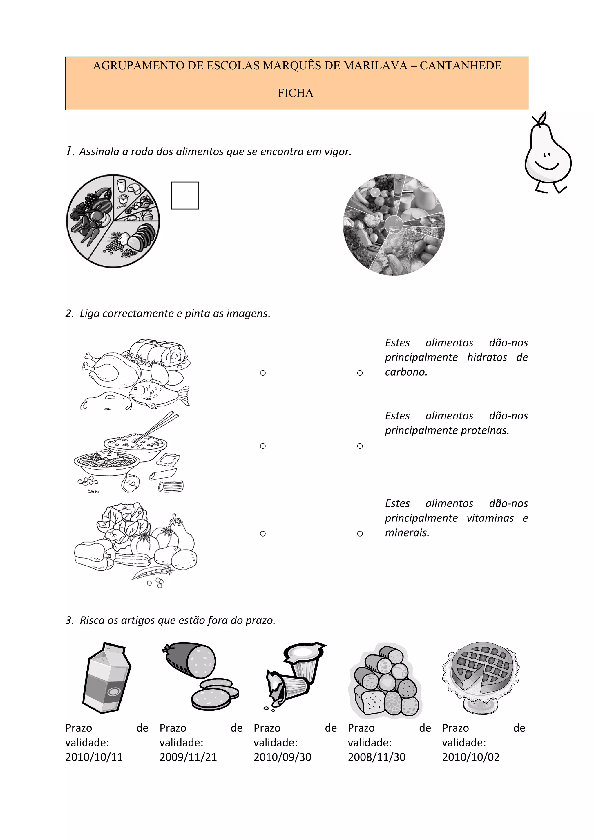Este documento contém uma ficha com perguntas sobre alimentação saudável e data de validade de alimentos. A ficha inclui perguntas sobre identificar os grupos alimentares na roda dos alimentos, associar imagens de alimentos aos nutrientes fornecidos, riscar artigos fora de prazo em uma lista, e responder se levaria uma embalagem de leite danificada para casa.