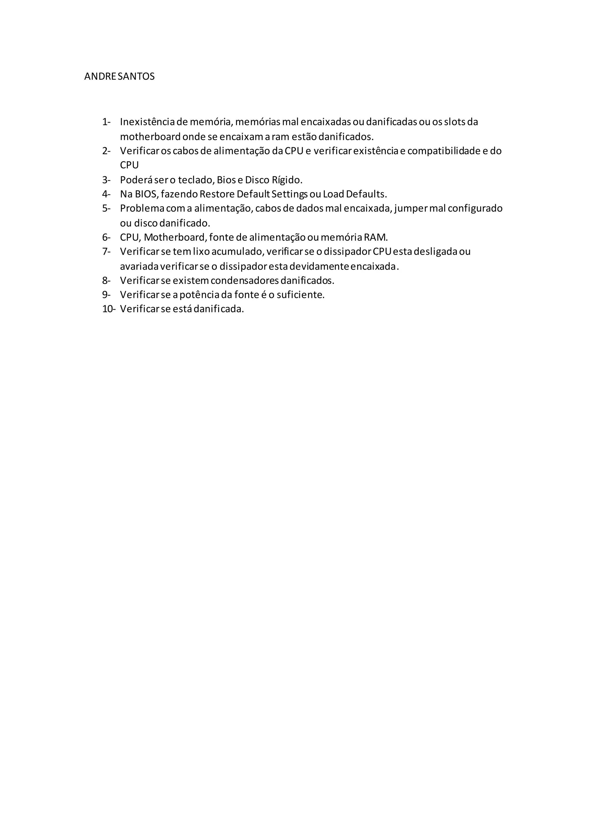 O documento lista possíveis causas para problemas com computadores, incluindo memória danificada, cabos de alimentação da CPU desconectados, problemas com teclado, BIOS ou disco rígido, alimentação ou cabos mal conectados, componentes danificados como CPU, placa-mãe ou fonte de alimentação.