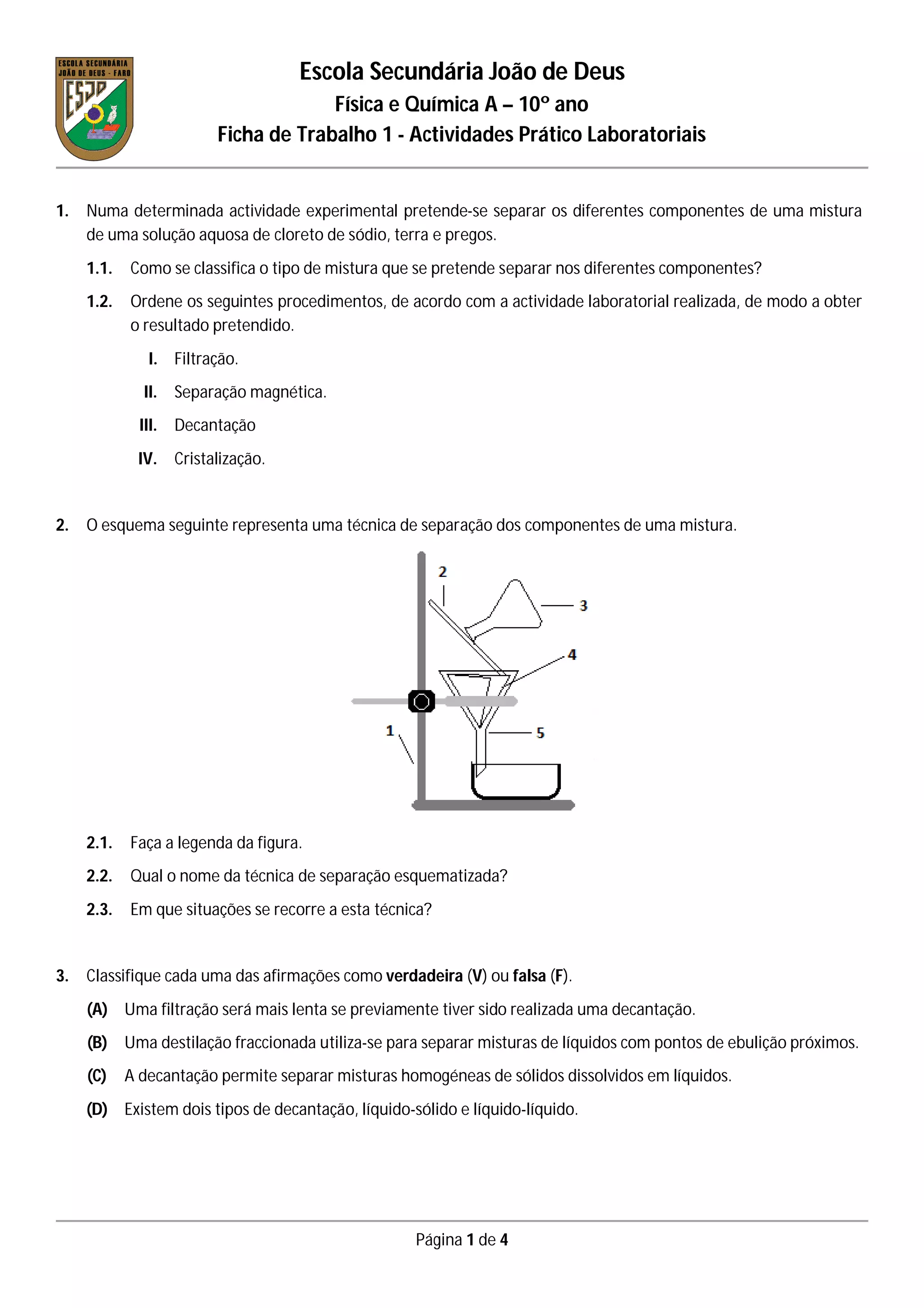 I. A ficha de trabalho apresenta vários exercícios sobre técnicas de separação de misturas e medições experimentais, incluindo decantação, filtração, separação magnética e cristalização.