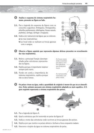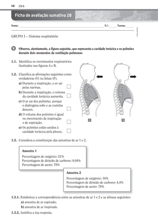 Este documento apresenta um teste sobre o sistema respiratório e circulatório humano com várias questões e figuras. As questões abordam tópicos como os movimentos respiratórios, a constituição do ar inspirado e expirado, o esquema do sistema respiratório, as defesas das vias respiratórias, o sistema respiratório dos peixes, os constituintes do sangue e o funcionamento do coração e da circulação sanguínea.