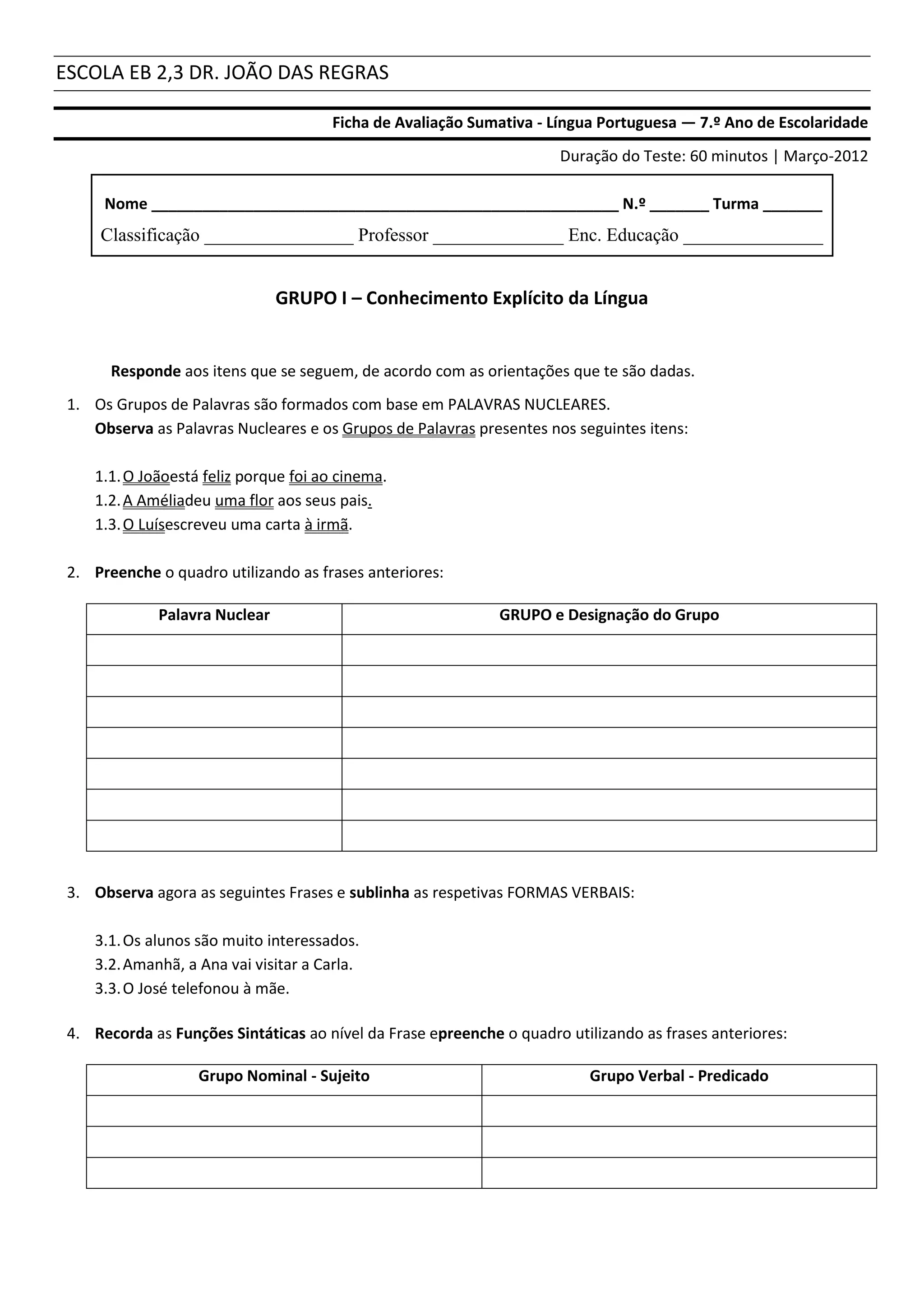 O documento é uma prova de avaliação sumativa de língua portuguesa para o 7o ano de escolaridade. Contém 12 questões sobre conhecimentos explícitos da língua portuguesa, incluindo grupos de palavras, formas verbais, funções sintáticas, derivação, composição e conectores discursivos.