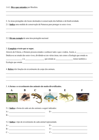 [1] O documento é uma avaliação de um aluno contendo perguntas sobre animais, plantas, habitats e adaptações. [2] Aborda conceitos como biodiversidade, áreas protegidas e funções do revestimento dos animais. [3] Inclui perguntas sobre a raposa-ártica, penas de aves e suas propriedades.
