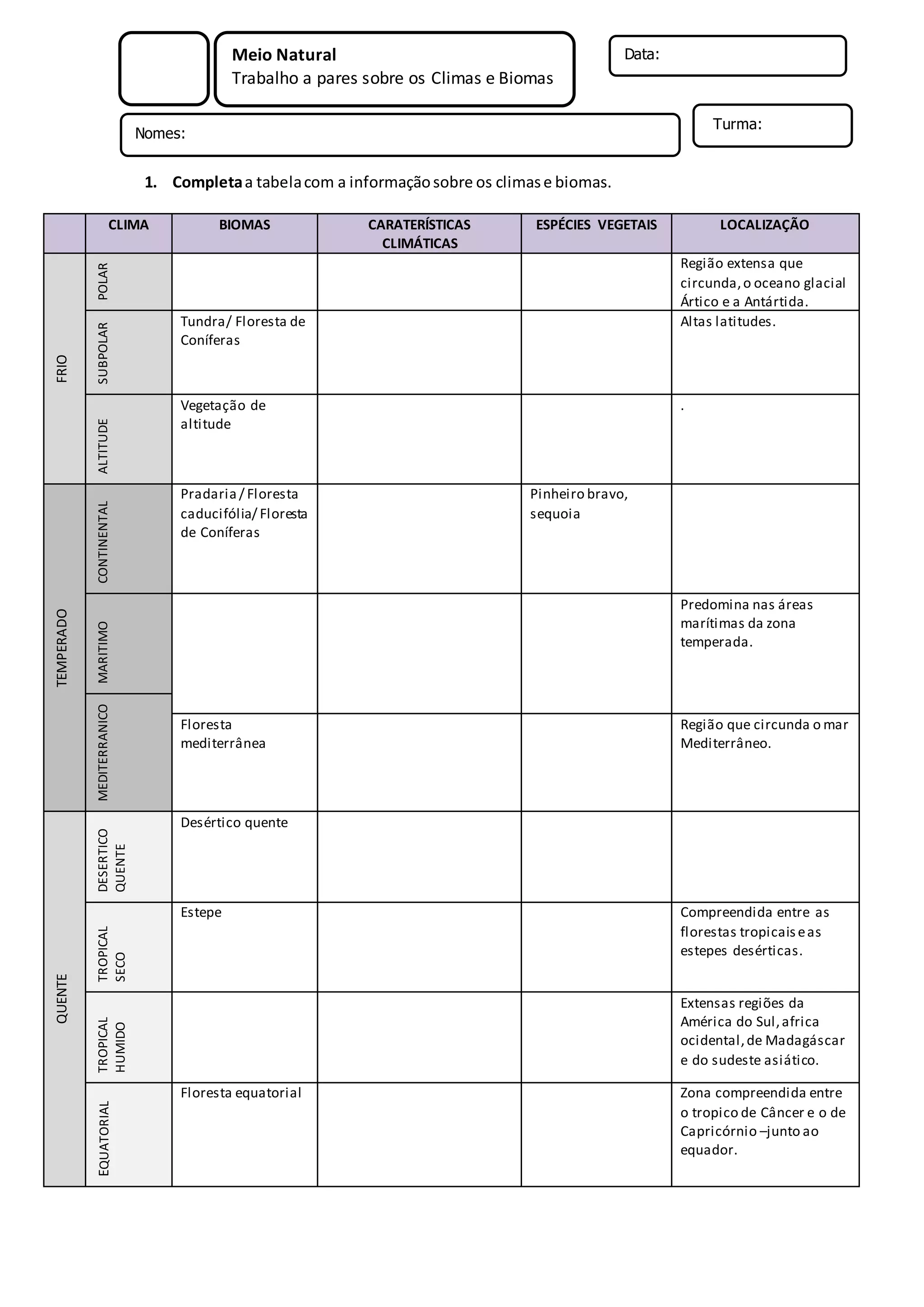 O documento fornece uma tabela comparando os principais climas e biomas do mundo, incluindo suas características climáticas, espécies vegetais comuns e localizações típicas. A tabela lista climas frios como polar e subpolar, temperados como continental e mediterrâneo, quentes como desértico quente e tropical seco e úmido, e equatorial.