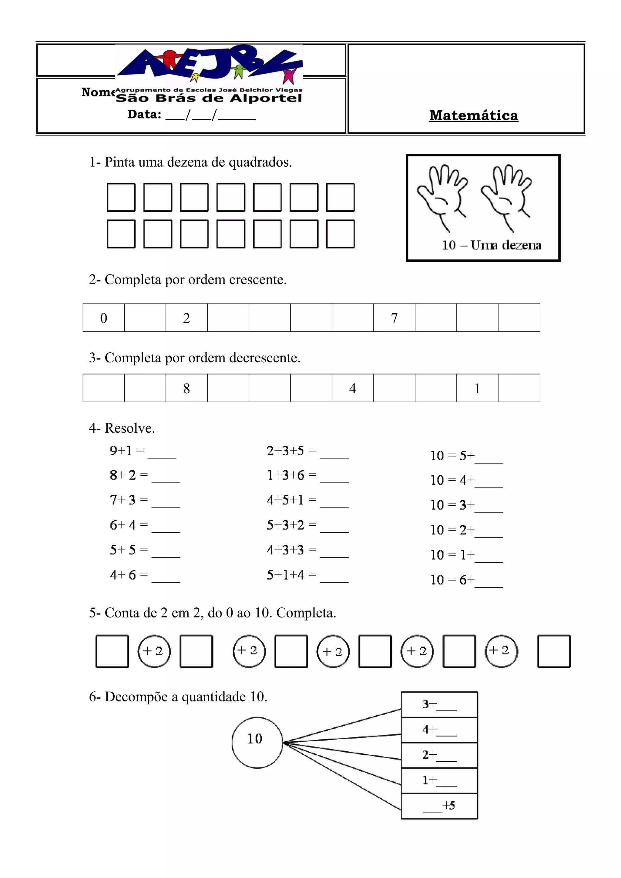 1. Pinta uma dezena de quadrados e completa exercícios de ordenação crescente e decrescente. 2. Realiza contagens de 2 em 2 até 10 e decompõe o número 10. 3. Pinta figuras indicadas por algarismos e uma dezena de flores, além de realizar comparações matemáticas. 4. Resolve um problema sobre fatias de bolo vendidas e sobrantes.