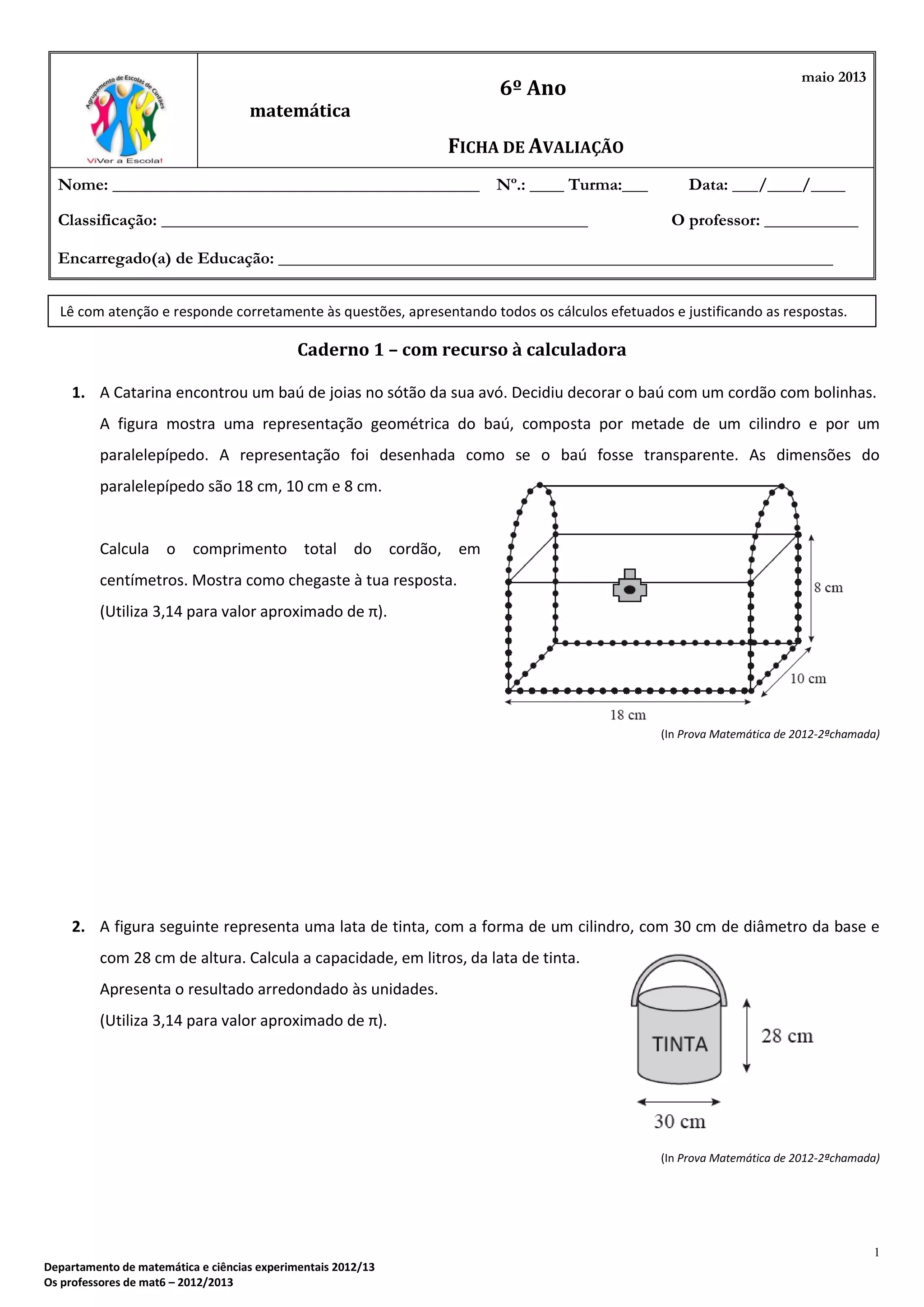 1) O documento apresenta uma série de exercícios de matemática para o 6o ano de escolaridade sobre tópicos como geometria, álgebra, estatística e sequências.