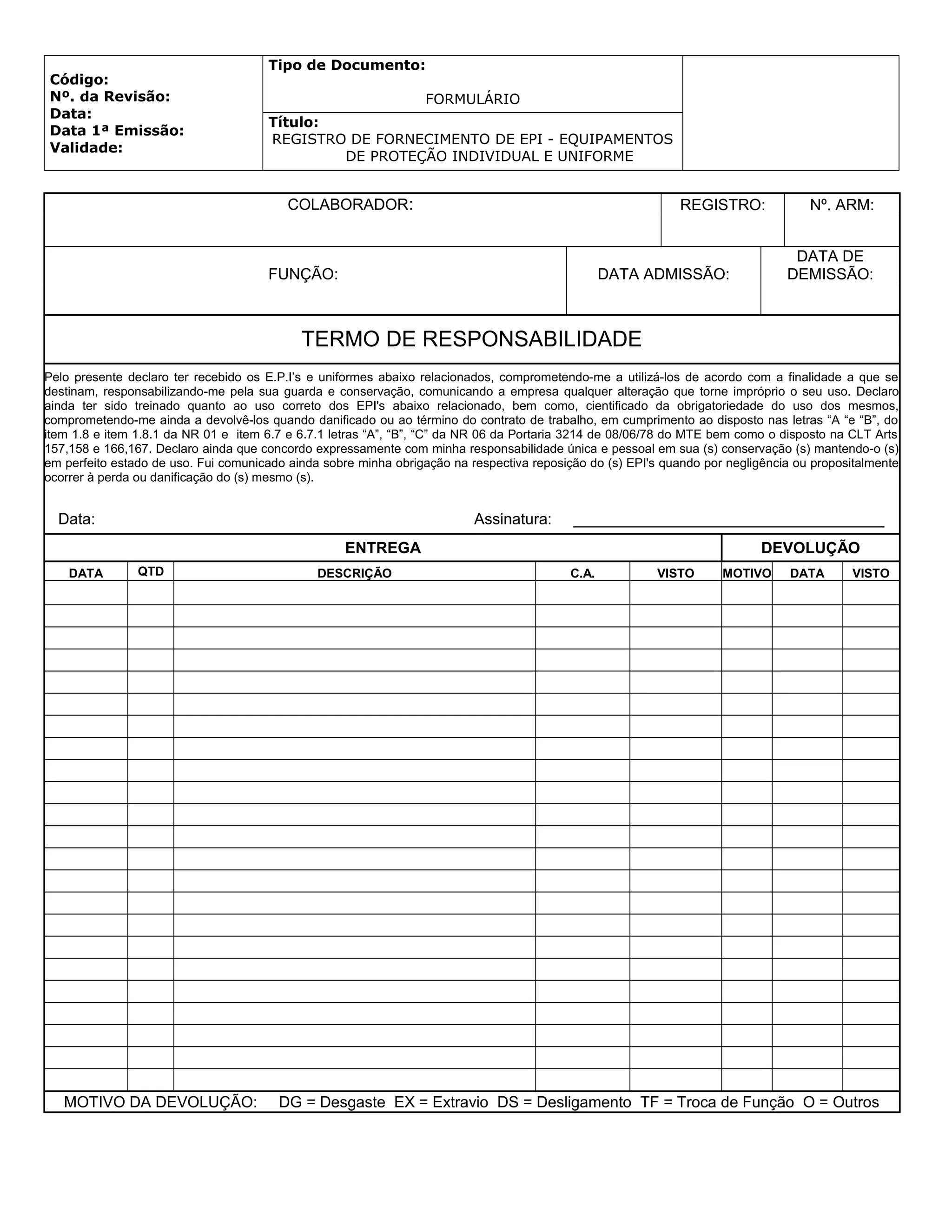 Este formulário registra o fornecimento de equipamentos de proteção individual (EPIs) e uniformes para funcionários, incluindo um termo de responsabilidade assinado pelo funcionário concordando em usar corretamente os EPIs fornecidos e devolvê-los ao término do contrato ou quando danificados. O formulário permite registrar as datas de entrega e devolução dos itens, assim como os motivos da devolução.